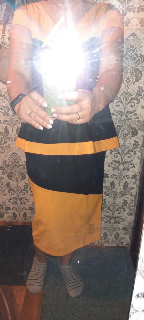 Жёлтая отделка юбки только спереди. На фигуру, с хорошей талией.