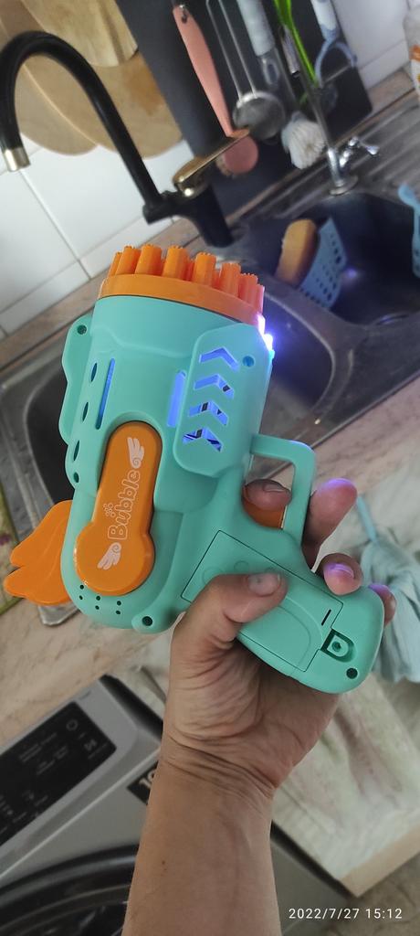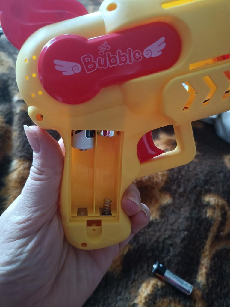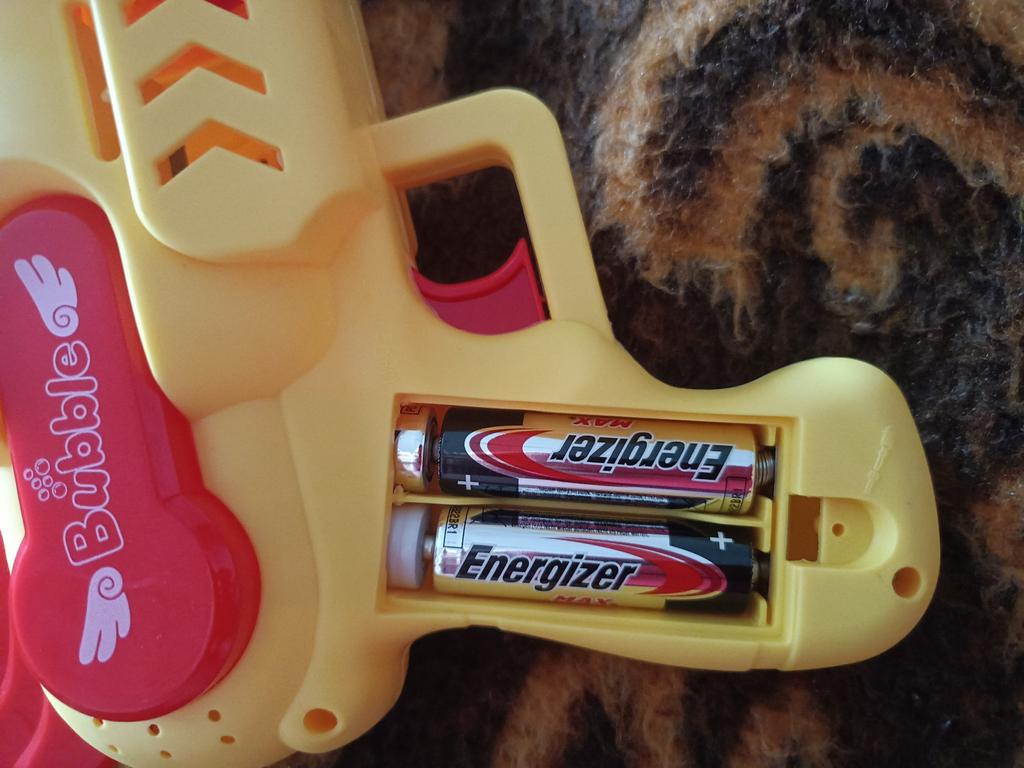 Добротный пистолет для мыльных пузырей. Развели средство для мытья посуды с водой - шикарный поток пузырей получился))) подсветка. Для работы нужны 4 батарейки аа. В комплекте сам пистолет без батареек и корытце для раствора. Не знаю сколько проработает, но приобретением довольна. Выиграла за 1 рубль. Заказ отправлен быстро. Посылка в Москву шла около месяца. Продавца рекомендую.