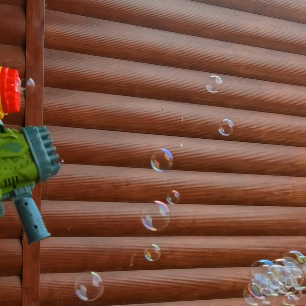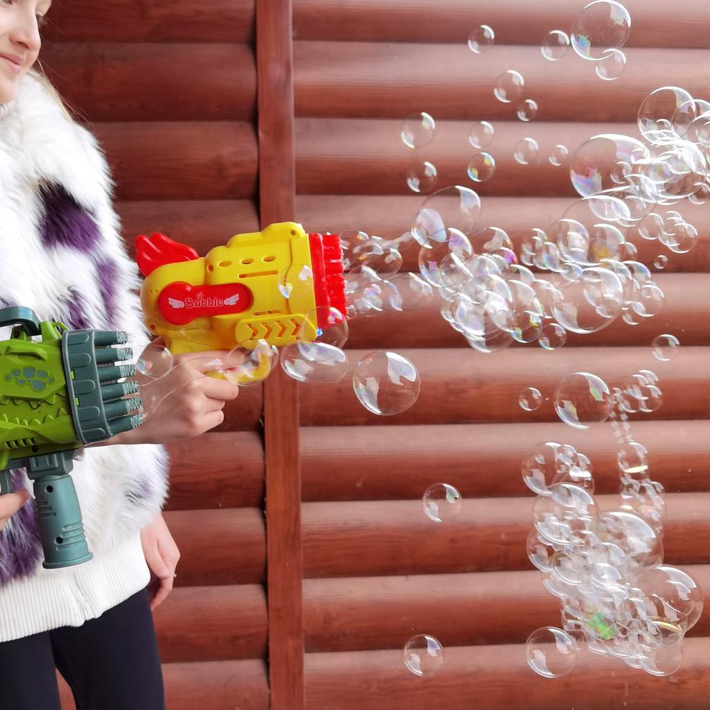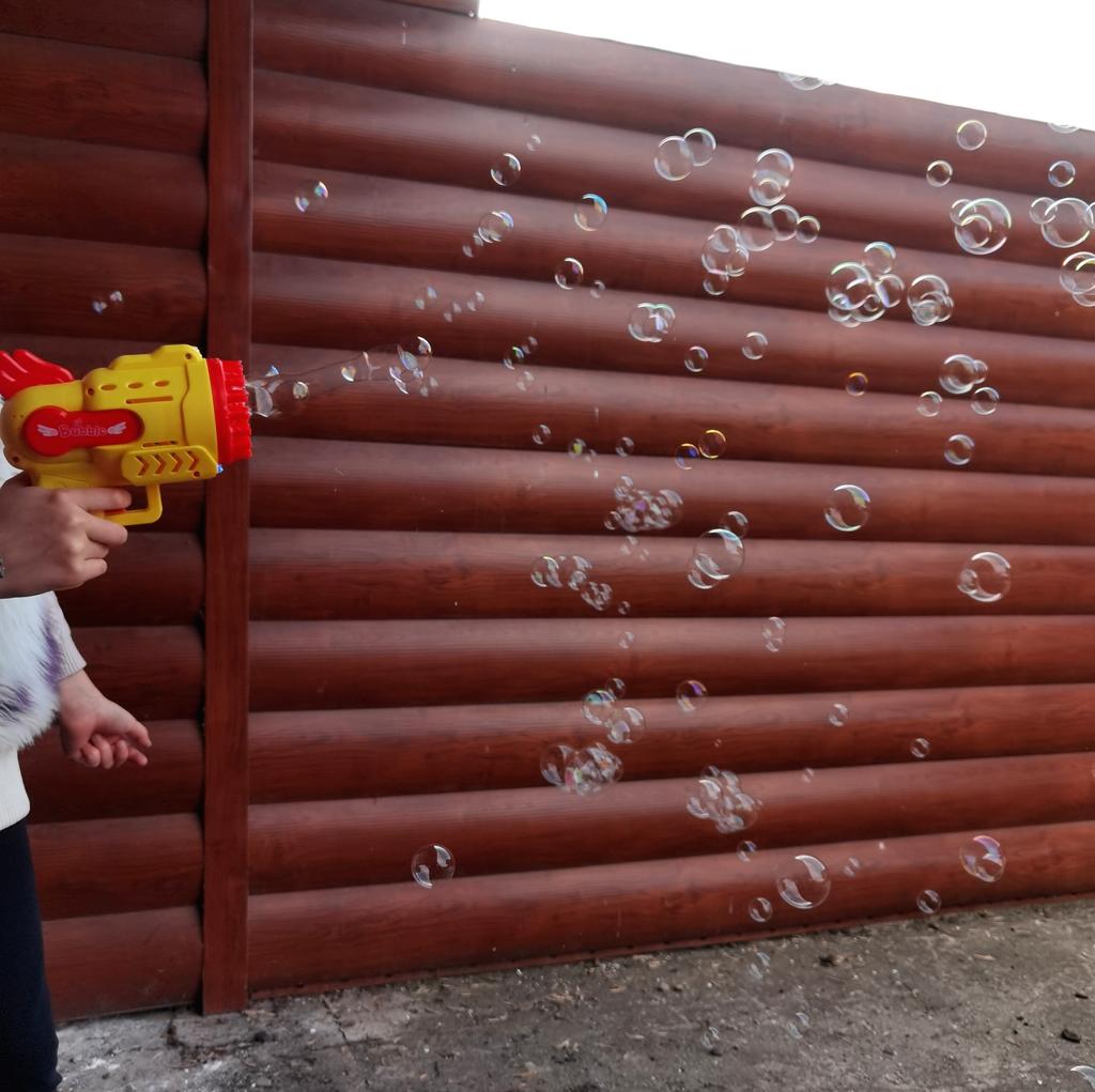 Пистолет для мыльных пузырей✨Видеообзор 🎥 Купили Саше и Глебу пистолеты такие ещё весной, а все обзор написать не могу (на дино-бластер пост есть, июньский). Исправляюсь. Мало ли, кто для дома закажет или заранее к лету. ☀ Начну, пожалуй, с того, что пистолет по сей день целый, единственное, батарейки меняли уже далеко ни один раз,но это уже мелочи. 😉 Приходит в пакетике, но цел и невредим. В комплекте сама пушка и чашка под мыльную основу. 🌼 Внешне полностью совпадает с изображениями продавца. Сделан из пластика. Количество отверстий под пузыри 29. По размеру не большой, но и не маленький-самое тяжёлое в нем это батарейки(4 пальчиковые - в комплект не входят). 😊 Суть работы бластера в том, что сторону с отверстиями мокаешь в чашу с мыльной жидкостью, а после нажимаешь на курок и куча маленьких мыльных пузырей вылетает из 29 отверстий. Детям безумно нравится! 🤩 Что касаемо нюансов, то мне не понравилось то, что нет такого множества пузырей, как на фото продавца. Оно в раза 2-3 меньше. Благо, детям и того хватило. ☝️ Внешне без претензий, а по функционалу и количеству пузырей ожидала большего, но 5 звёзд ставлю, ибо по качеству претензий нет вообще. 👌 P. S. Дети бегали во дворе весной после дождя, поэтому одежда соответствующая. Не обращаем внимание! 😉