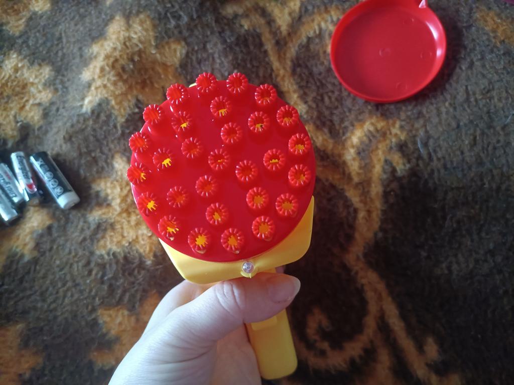 Доставка месяц. Упаковка в обычный производственный пакет+ упаковка в пупырчатый . Приехал целый и рабочий))) Цвет пришёл тот который заказала. Размер+-16*15 см. В комплекте сам пускатель мыльных пузырей+ тарелочка. Он работает от 4 батареек АА. Кнопка не будет нажиматься пока не выставите батарейки, я сначала испугалась думала что не работает 🤪. Но всё работает!) Потом увидев что в отсеке для батареек слишком много пространства подумала, что они там " утонут"- всё хорошо на свои места, всё плотно стоит. Во время работы загорается синяя лампочка. Спасибо Джуму за доставку и хорошую упаковку