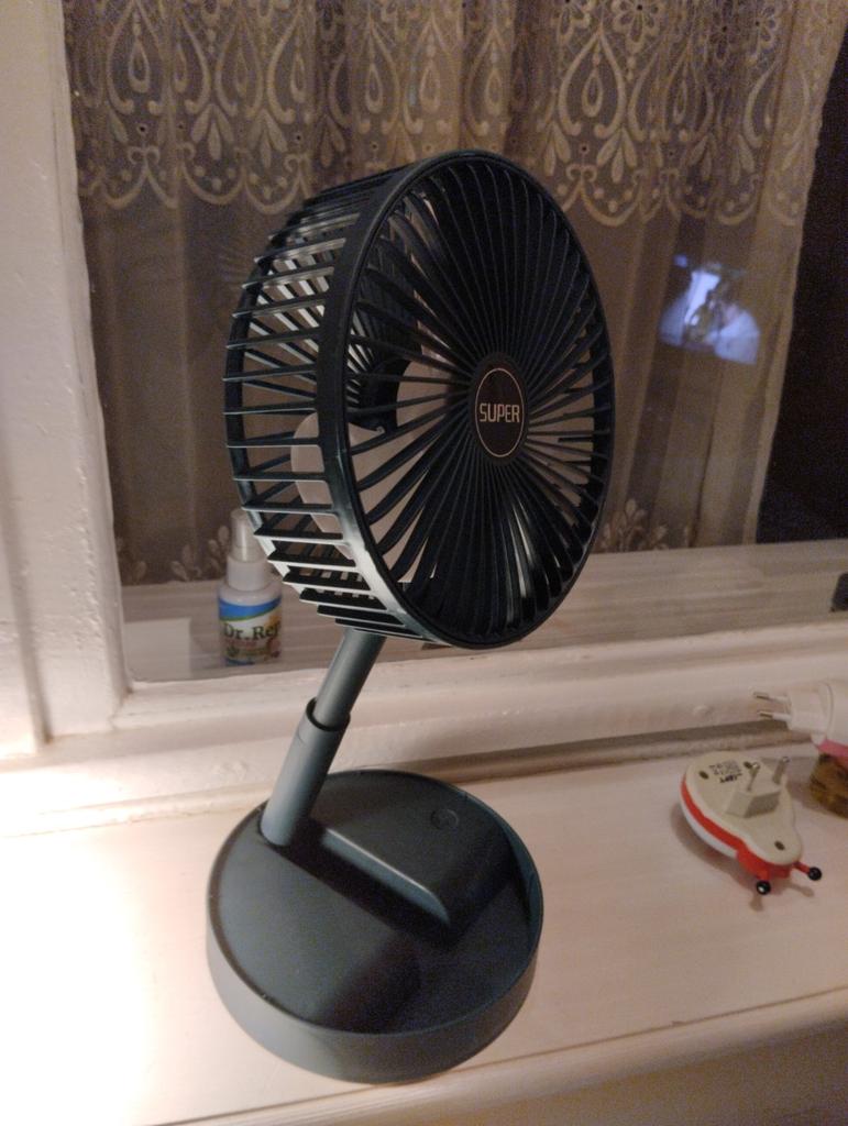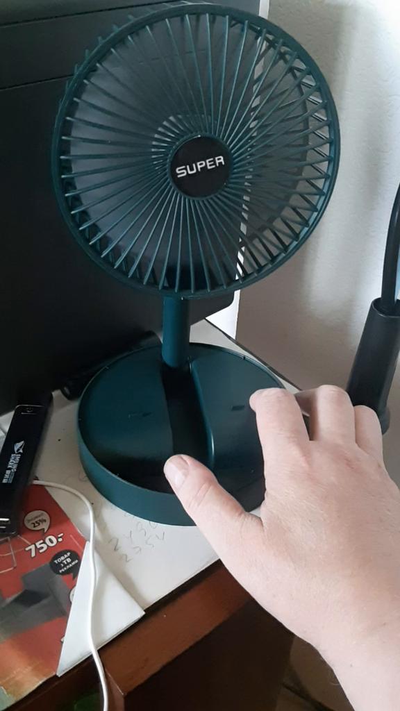 Удобный складной мини-вентилятор, то , что надо. Занимает мало места, имеет регулировку по высоте, наклону, 3 уровня мощности, USB зарядку и просто от батареек.Дует очень хорошо, мощно.Один только минус, сделан из дешевого пластмасса, но и цена поэтому соответствует.Успела взять за 368 руб😁, сейчас они подорожали😭.Понравился, теперь посмотрим сколько прослужит. Пришел как всегда в помятой коробке,😖 но сам целый.😄