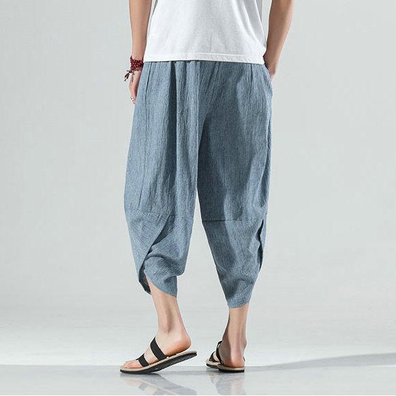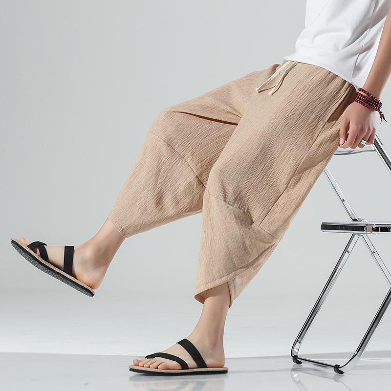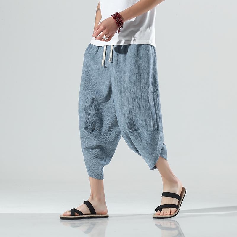 Летние мужские повседневные брюки до икры в китайском стиле, широкие хлопковые льняные шаровары, мешковатые брюки