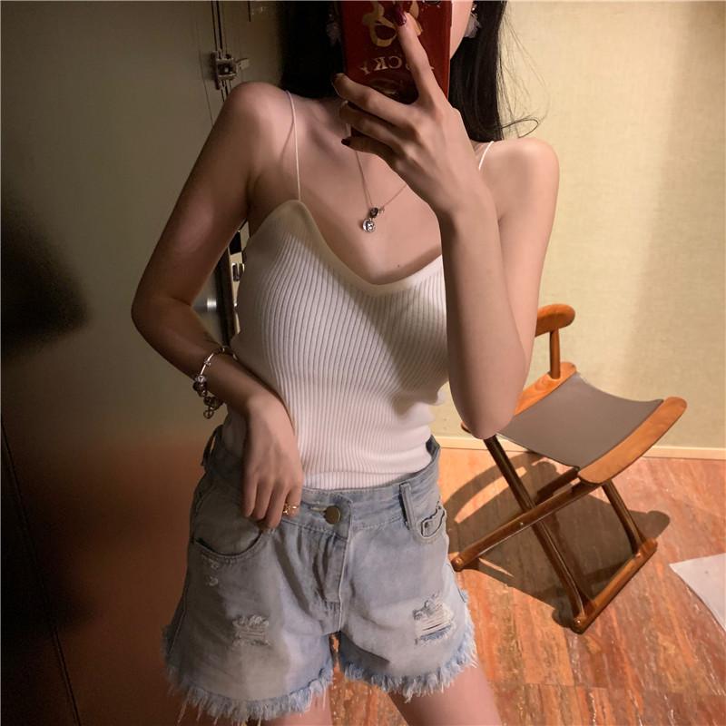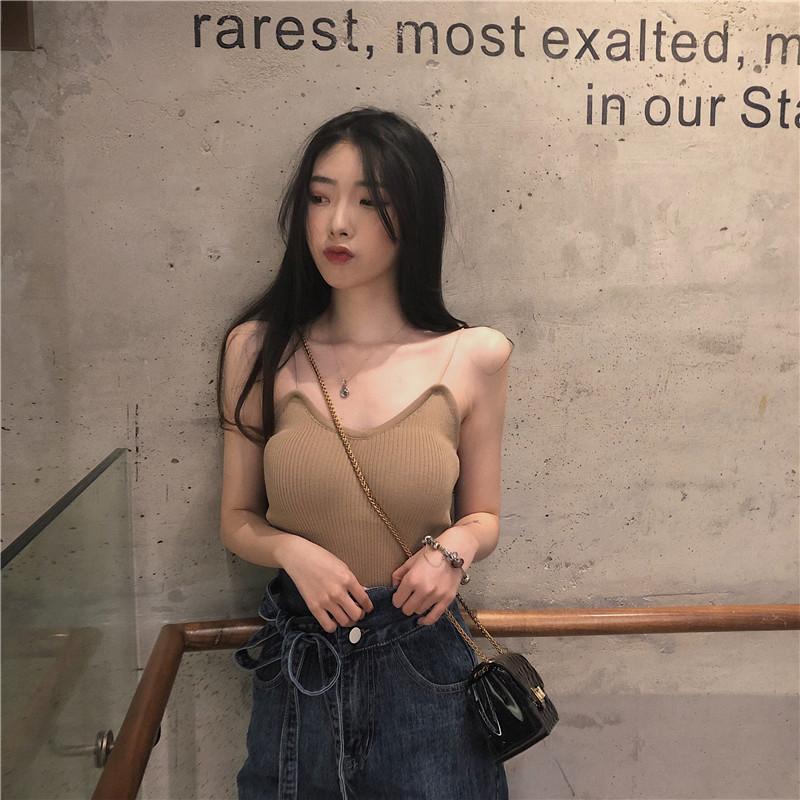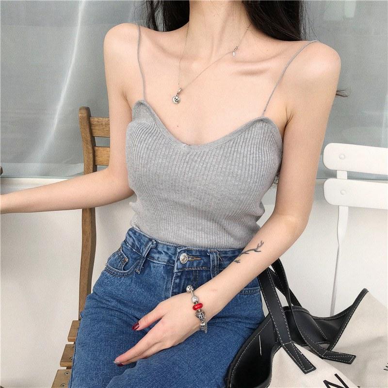 Весенне-летняя женская однотонная вязаная майка без рукавов с лямкой на шее и внутренней нижней частью