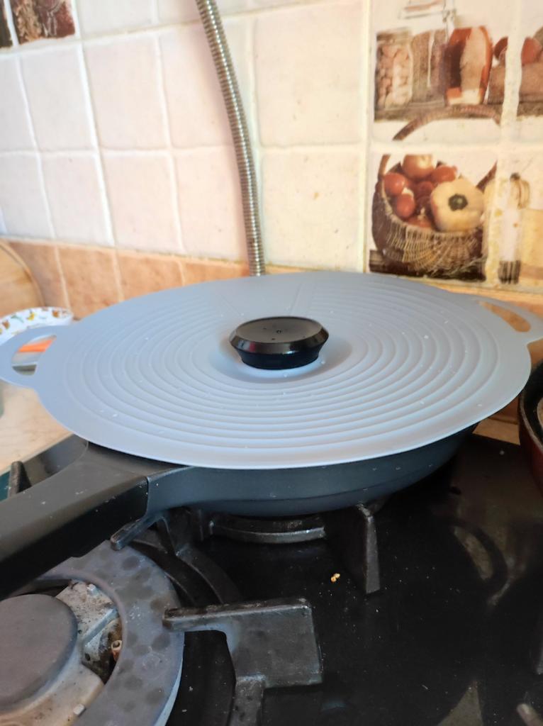 Крышка очень плотная , толстая, тяжёлая, мне кажется , будет удобно пользоваться, если держать за ручку наверху, то крышка хорошо присасывается к сковородке, а снимать надо брать за ручки сбоку. Нам понравилась, буду ещё заказывать другого размера.