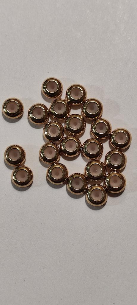 Золотые бусины диаметром 8мм и высотой 4мм в количестве 21 штука из заявленных в описании двадцати, пришли за шесть недель. Внутри - бесцветная силиконовая вставка диаметром 5мм с отверстием для тросика в 1мм.