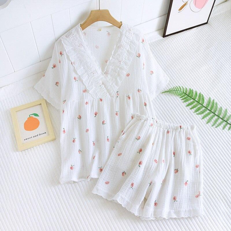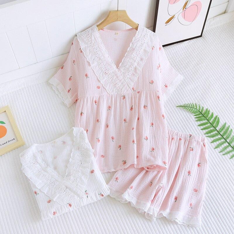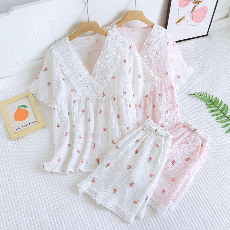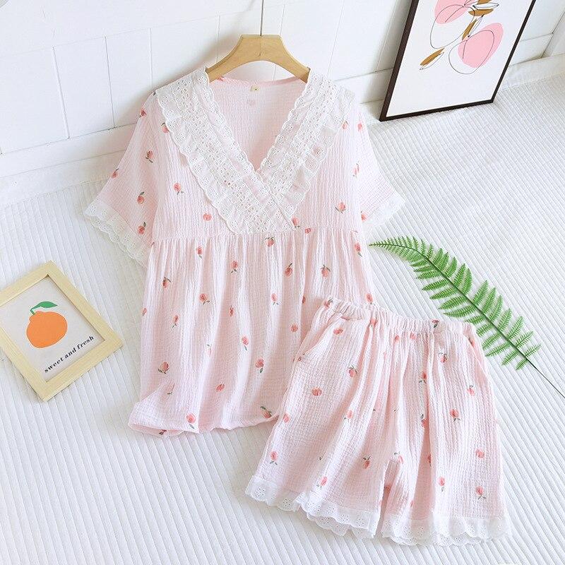 Японские летние новые женские пижамы с короткими рукавами, шорты, комплект из двух предметов, 100% хлопок, креп, V-образный вырез, домашний костюм большого размера, женский костюм