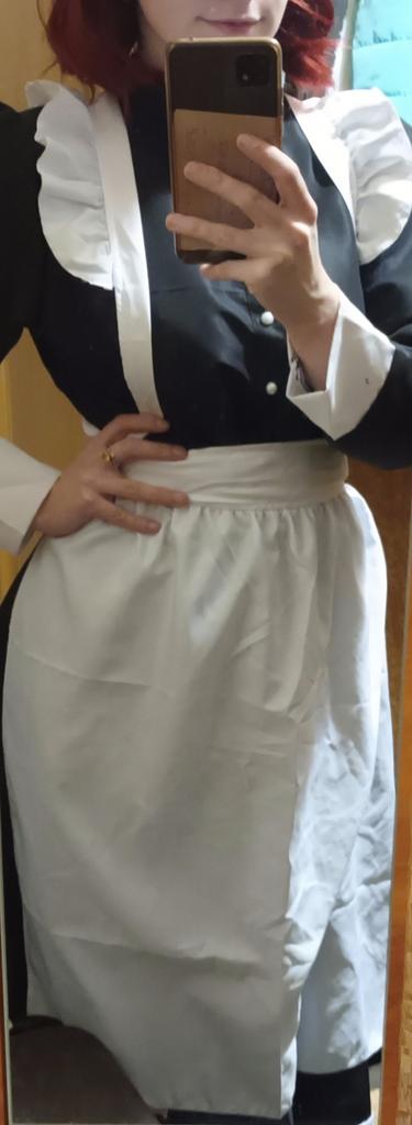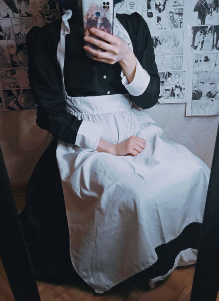 За эти деньги, очень даже хороший вариант) Мне нужен был костюм для закоса на Мейлин (Тёмный Дворецкий)) Позже я перешила лямки и завязки фартука так как мне было нужно) Ткань платья плотная, несколько блестит (на последней фото видно). На рост 158-160 платье немного ниже середины икры. В комплекте: форма (платье), фартук, повязка на голову (ободок), бант фартука (крепится на булавке сзади). Спасибо, все круто) P.S.: всё хорошо, костюм продержался, как надо)