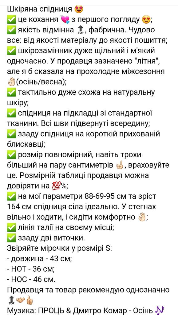 Кожаная юбочка 🤩 ✅ это любовь 💘 с первого взгляда 😍. Покупала по отзывам девочек-блогеров; ✅ качество просто отменное 🔝, фабричное. Чудесно всё : от качества материала до качества пошива 🔥; ✅ кожезаменитель очень плотный и мягкий одновременно. У продавца указано "летняя", но я бы сказала на прохладное межсезонье 👌🏻(осень/весна); ✅ тактильно очень похожа на натуральную кожу; ✅ юбка на подкладке из стандартной ткани. Все швы подвернуты внутрь 👌🏻и подол пришит тканями друг к другу; ✅ сзади юбка на короткой скрытой молнии; ✅ длина мини; ✅ размер полномерный, даже немного в большую сторону на пару сантиметров ☝🏻, учитывайте это. Размерной таблице продавца можно доверять на 💯%; ✅ на мои параметры 88-69-95 см и рост 164 см юбка села идеально. В бёдрах свободно, и ходить, и сидеть комфортно 👌🏻; ✅ линия талии на своём месте; ✅ сзади две вытачки; ✅ запаха практически не имеет. Сверяйте мерочки в размере S: - длина - 43 см; - ПОТ - 36 см; - ПОБ - 46 см. Продавца и товар рекомендую однозначно 🔝🤝🏻👍🏻 Музыка: ПРОЦЬ & Дмитро Комар - Осінь 🎶