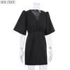 HOUZHOU Черное платье женское с v-образным вырезом и высокой талией корейское классическое базовое элегантное мини-платье трапециевидной формы с короткими рукавами и пышными рукавами