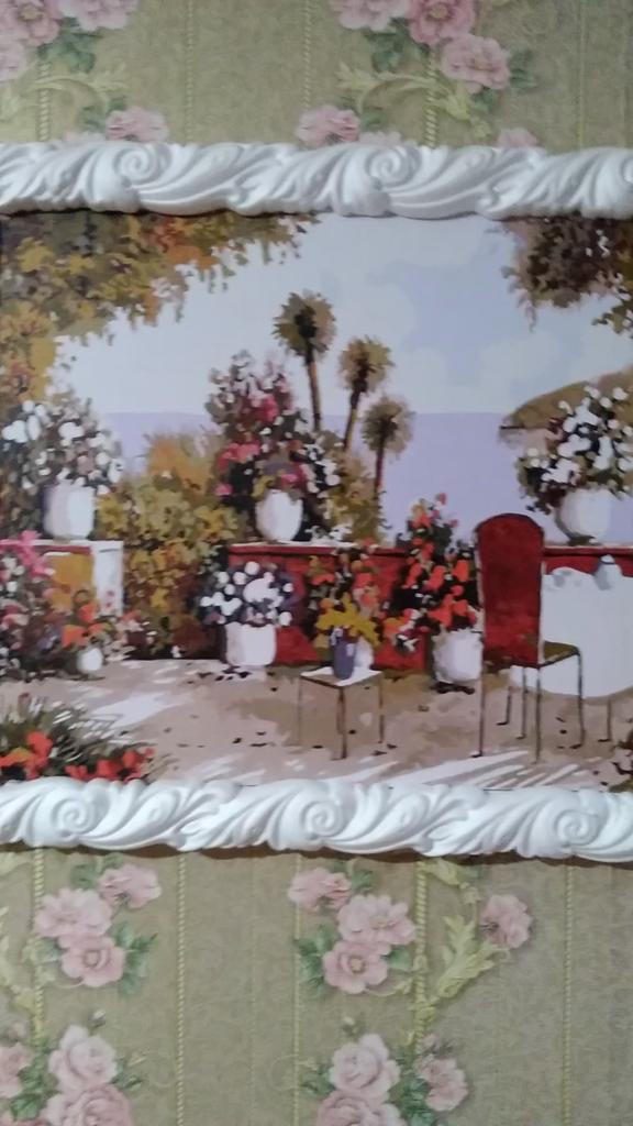 Это самая быстрая доставка с джума 1 месяц, раскраска пришла в пакете без коробки. В наборе краски 3 кисточки и крепление для рамы.