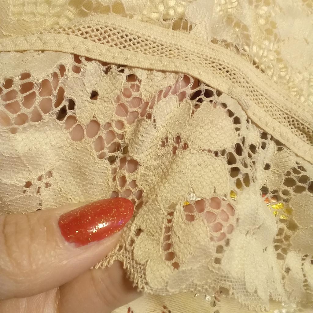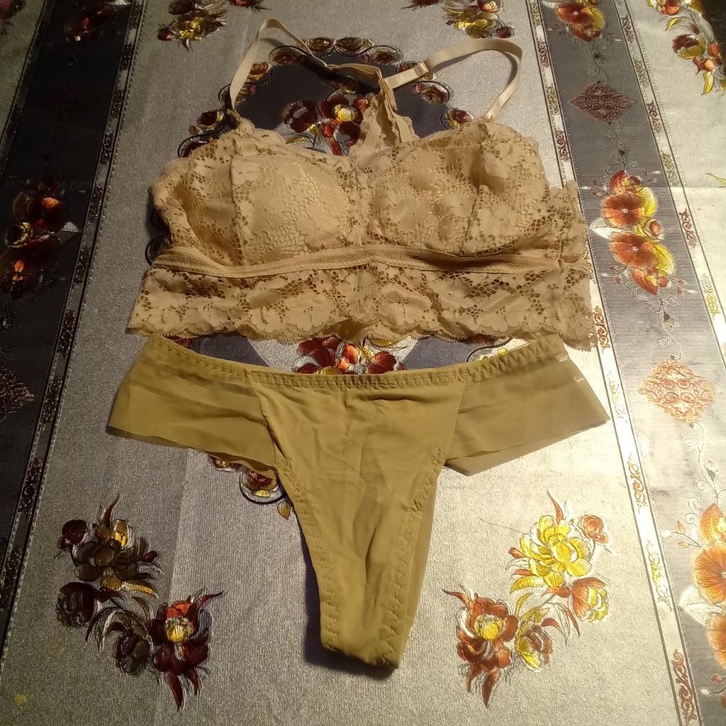 Интересный комплект женского нижнего белья 👌💯 Комплект состоит из бюстгальтера и трусиков -танга☝️ Бюстгальтер на тонких регулируемых бретелях,со встроенным пуш-ап (при желании можно убрать), без металлических каркасов,с красивым дизайном на спине, полностью из кружева ☝️🤗 Трусики заметно отличаются от бюстгальтера(они не кружевные)☝️ Тонкий нейлон, спандекс 💯, ластовица х/б;посадка средняя,тонкие, лёгкие, эластичные.👌💯 Цвет бежевый, выглядит как на фото продавца 🙂 На параметры ОГ 94, ОТ 75, ОБ 98, рост 1, 65 я взяла размер L/80☝️ Бюстгальтер немного свободен,но некритично 🤗 Трусики как раз 👍 Качество хорошее 👍💯: швы ровные, аккуратные, кружево мягкое, дефектов не имеет 💯 Рекомендую 🤗 к покупке 👌