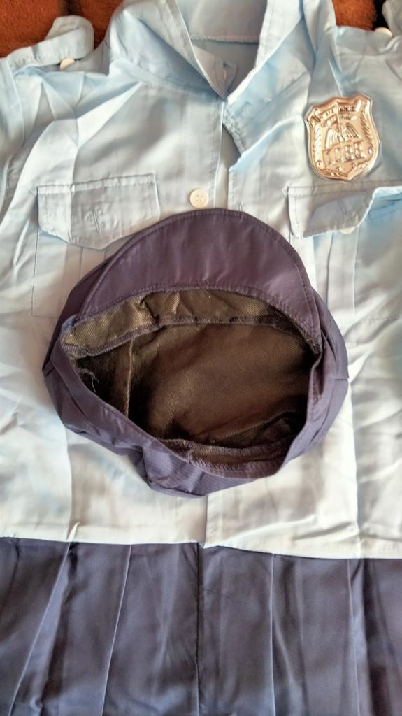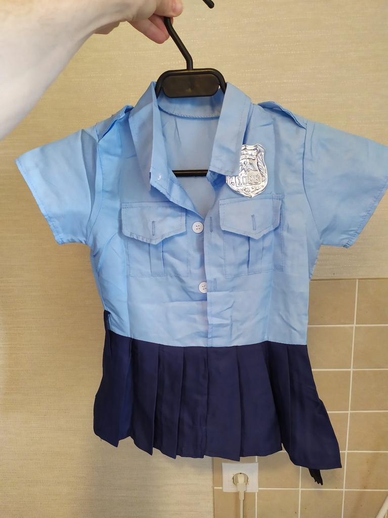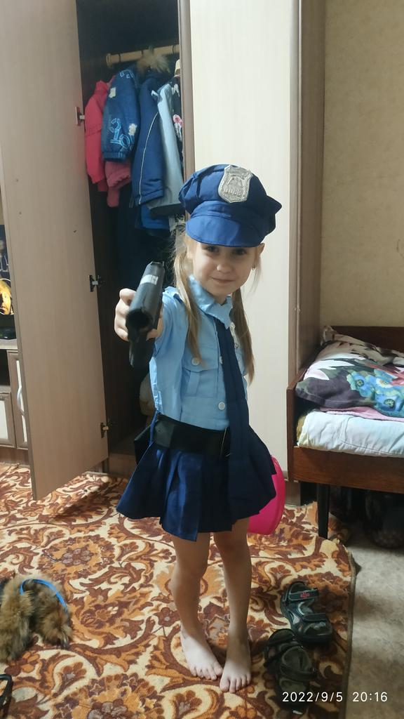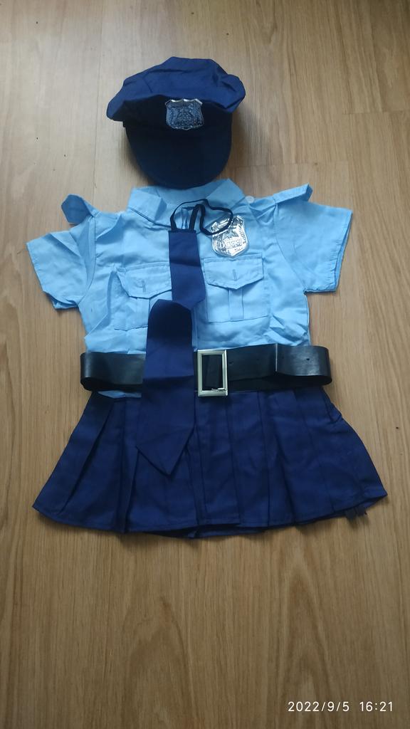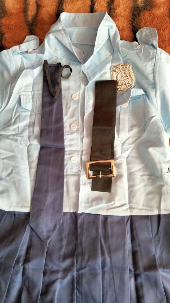 Выйгрышь за 1 рубль.Костюм полицейского.Рубашка и юбка,одно целое.Молния сбоку,что бы удобнее надевать.Галстук на резинке,ремень,кепка с пластиковым жетоном как и на рубашке.Дочка довольна.