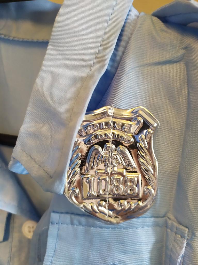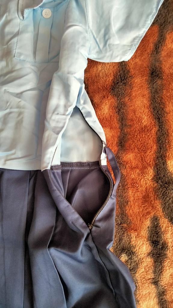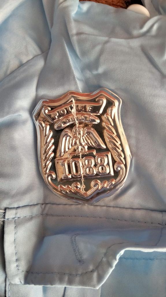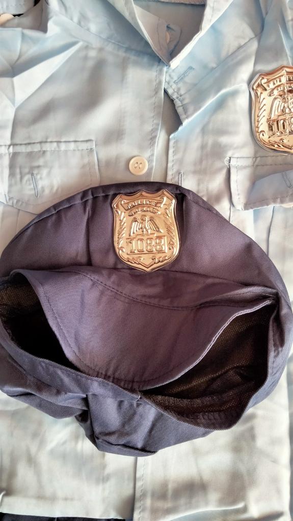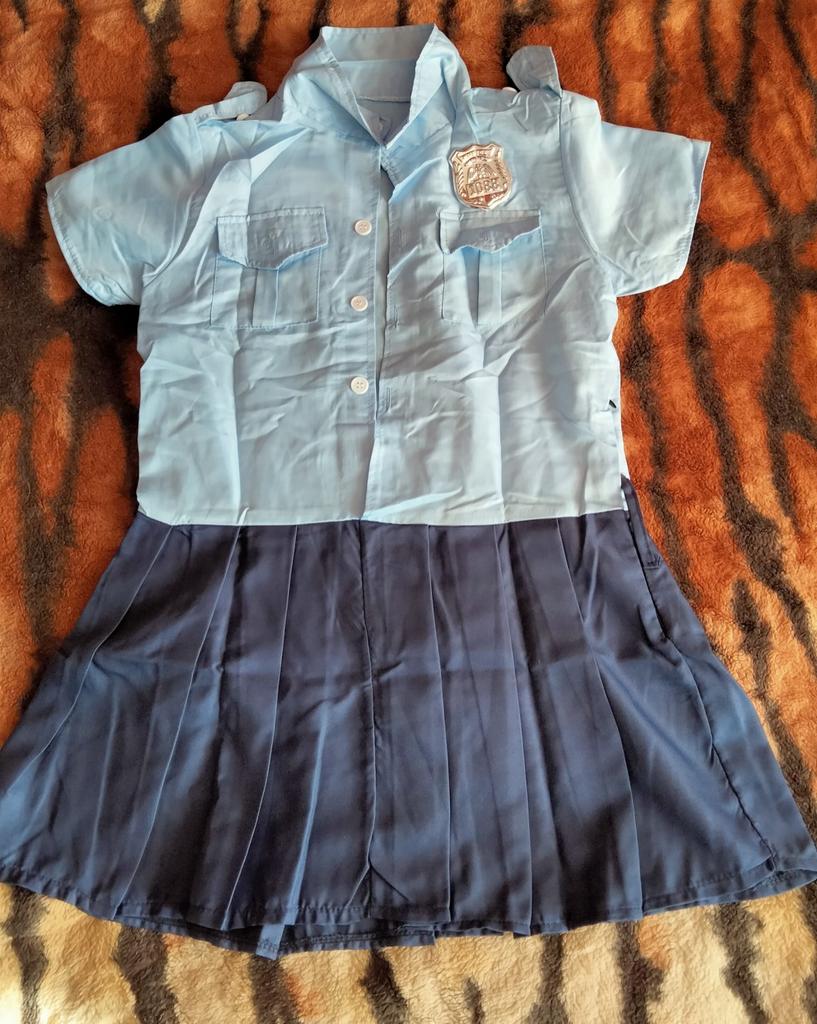 Выйгрышь за 1 рубль.Костюм полицейского.Рубашка и юбка,одно целое.Молния сбоку,что бы удобнее надевать.Галстук на резинке,ремень,кепка с пластиковым жетоном как и на рубашке.Дочка довольна.
