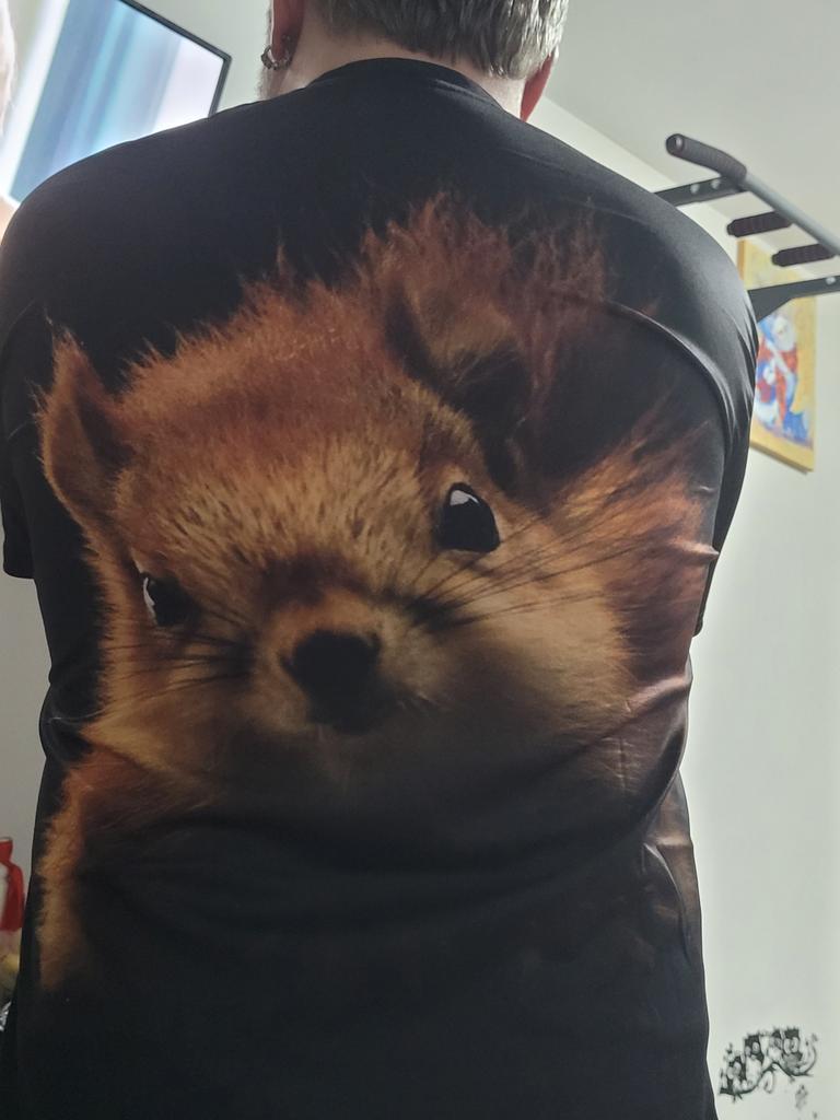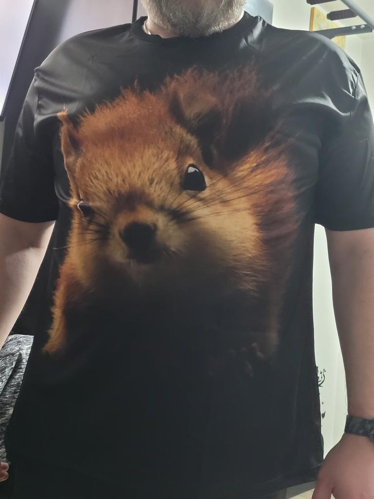 Купили футболку ради белки, ткань синтетика, лично я такие ношу с удовольствием. Смотрится прикольно. Покупали на размер 56, достаточно свободно. Рисунок можно и помельче, но и этот смотрится хорошо. В общем, муж доволен, я довольна. Продавца рекомендуем. PS Любимая футболка мужа, когда хочет эпатировать друзей! Ткань не пилингуется, легко стирается, не линяет, не теряет формы.