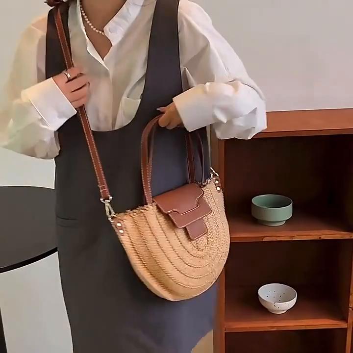 Yogodlns Ретро полукруглая соломенная женская сумка ручной работы тканая пляжная портативная сумка через плечо