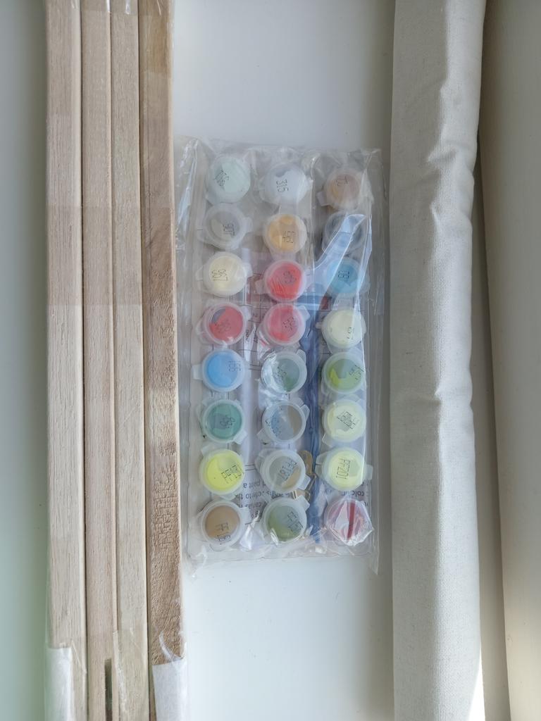 Отличная картина! Добралась ровно за 30 дней. Выиграла в акции "Товар за 1 рубль". Пришла в полном комлекте: Холст, краски, кисти, подрамник и кнопки. Сам холст очень плотный, приятный на ощупь, хорошего качества и хорошо прокрашен. Краски все пронумерованы. А вот подрамник оставляет желать лучшего. В прошлой картине тоже был кривоват. Он не обработан, чистое дерево и местами кривой. С лёгкостью можно схватить занозу, с этим надо быть аккуратнее.