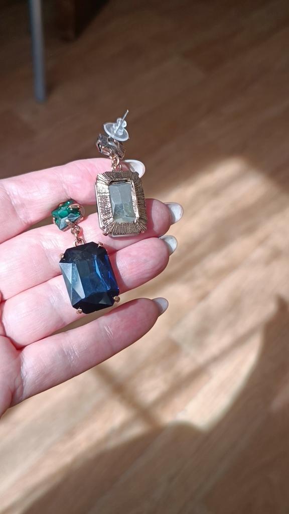 Прекрасные сережки с камушком темно- синего цвета и зелёным. Застёжка гвоздик. Не тяжёлые. Сняла 2 видео, смотрите и смело покупайте.