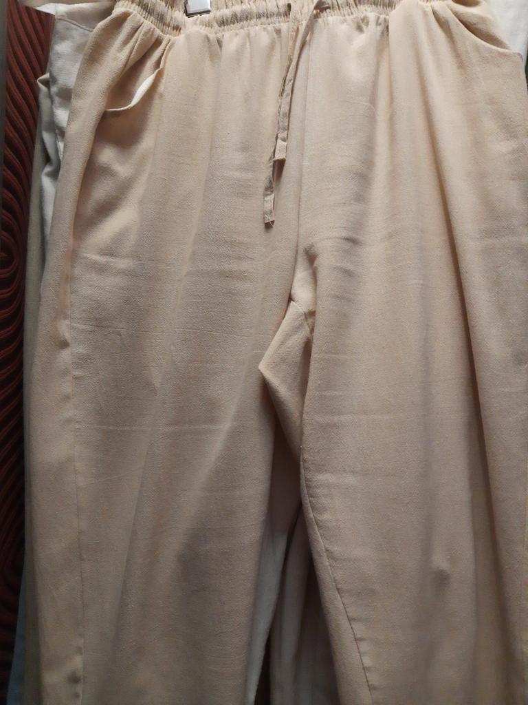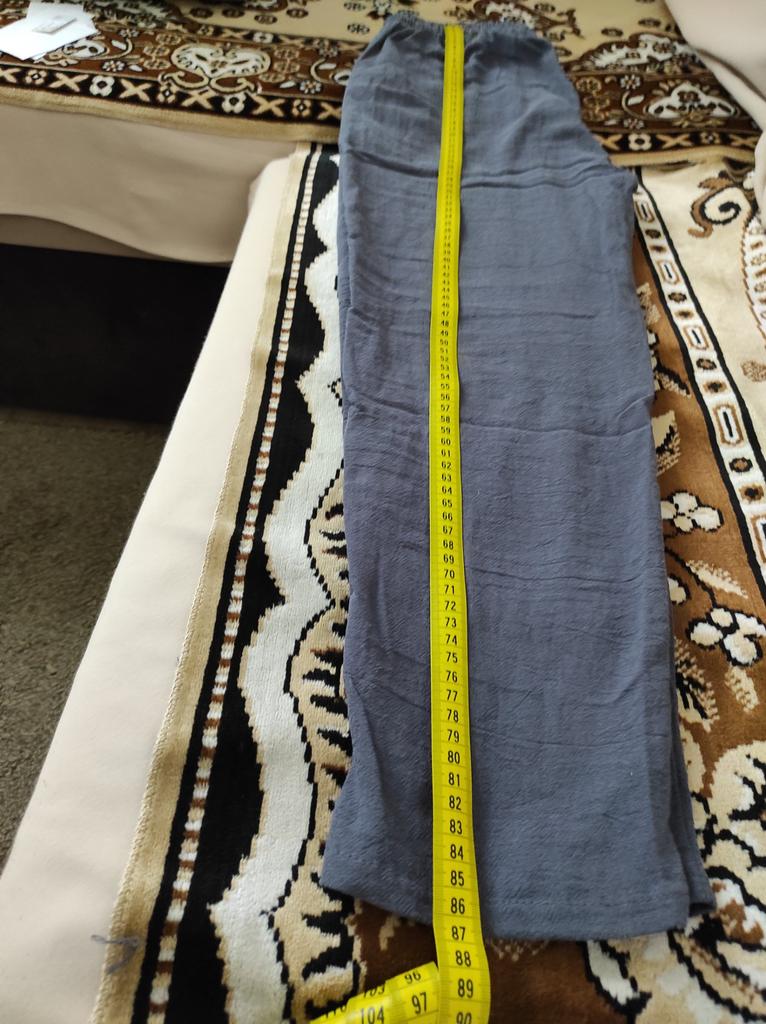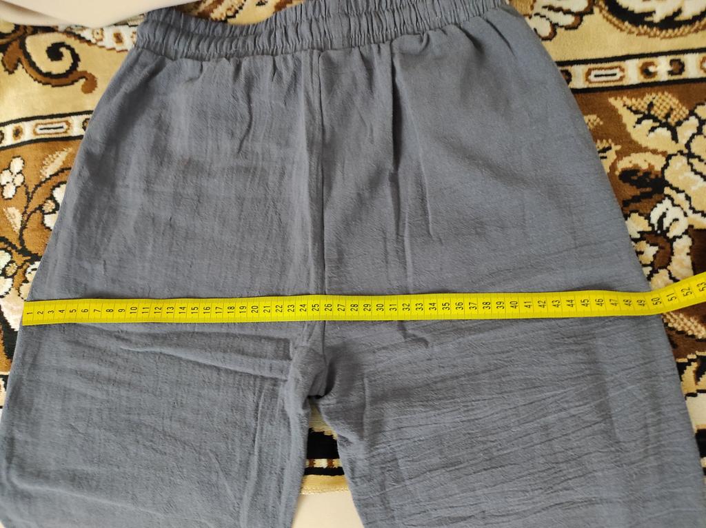 Получила в общей посылке.Спасибо Джум.Это не брюки, а капри.При моем росте 162 длина брючины выше щиколотки.Объем в бедрах 104см.Правда еще не стирала, может сядет.В носке приятные. Ношу 3 дня, а на поясе ткань полезла.Не очень приятна.И в зависимости кто как любит носить.Мне бы на размер больше надо было брать, по жаре свободней приятнее.Спасибо продавцу прислал упаковано хорошо.