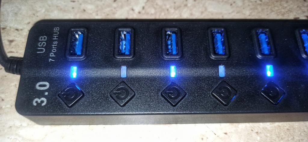 Из 4-х портов только один действительно USB 3.0, остальные USB 2.0. С точки зрения конструкции, хаб достойного качества с удобными выключателями для каждого порта. Для подключения внешнего питания используется разъём типа 3.5x1.35мм; однако, в этом сценарии у хаба отсутствует защита от обратного питания, то есть внешний ток подаётся обратно в компьютер/устройство.
