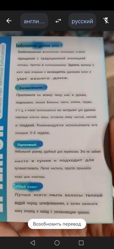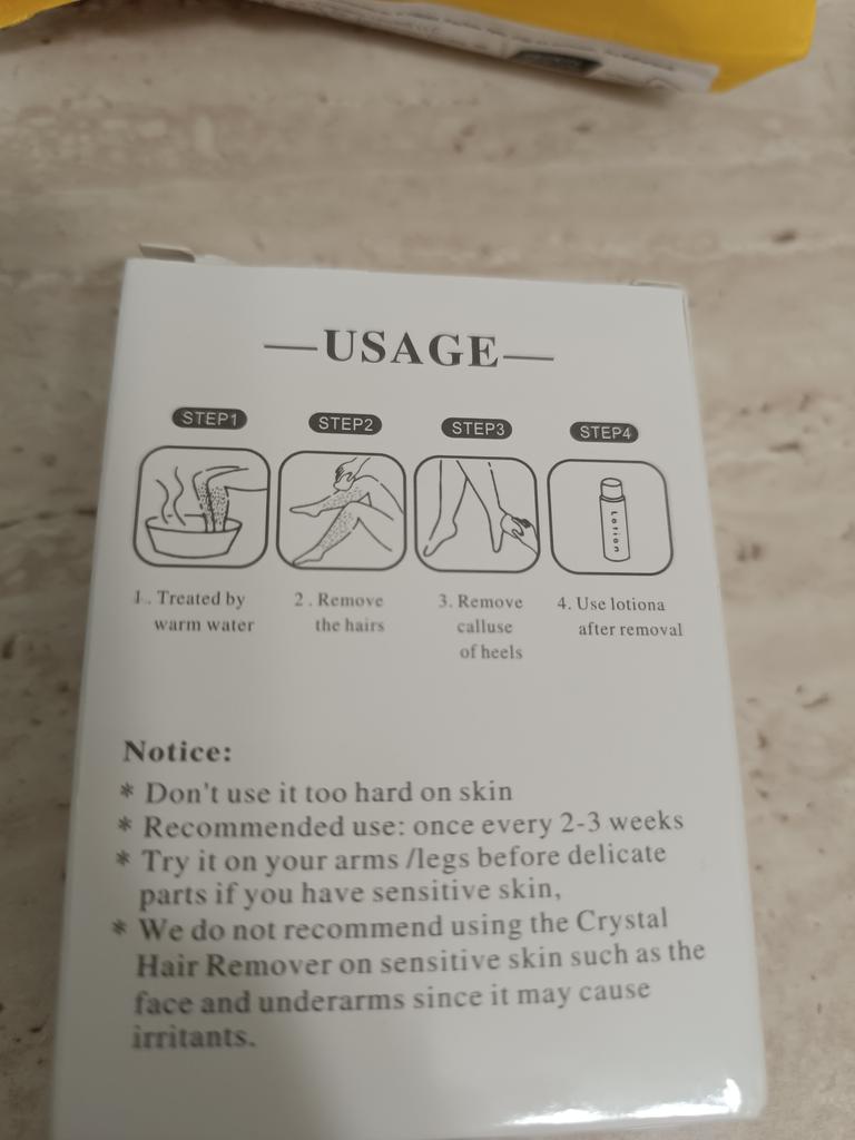 Увы печалька и небольшая.Коробочка помята а само изделие с повреждением небольшим( скол с трещиннкой), пупырки слишком маленькие видимо для такой доставки.На коробке есть инструкция, но я использовала без распаривания, и не сильно нажимая- прибор работает, убирает волоски при пилинге круговыми движениями, при этом отшелушивается ещё и верхний отмерший слой кожных чешуек, абсолютно безболезненно ! И у меня очень чувствительная кожа, никакого раздражения на ней! Супер!👍Дополняю, через минут 30-40 появилось чувство покалывания и небольшого жжения, нанесла крем успокаивающий,места депиляции стали немного горячее покраснели таки., Но думаю что через пару часов всё пройдёт.Прошло только через 3 дня, и после кожа наоборот стала в этих местах суховатой . Резюме: эта штучка работает как бритва, и с нежной кожей большой вопрос стоит ли использовать. И уж точно не стоит пользоваться круговыми движениями!!! как я это сделала. Её хорошо использовать за 3 дня перед процедурой лазерной депиляции, как раз отрастают волоски нужной длины для этого.Но такой эффект возможно только у меня из за тонкой кожи.