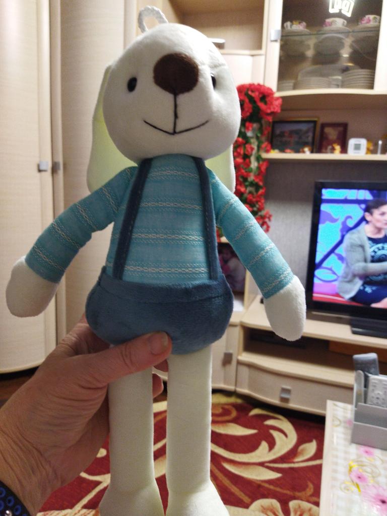 Наконец то пришёл. О ч е н ь долгая доставка. Упакован был плохо,в один пересылочный пакет. А в остальном всё хорошо. Зайка понравился. Спасибо большое. Рекомендую.