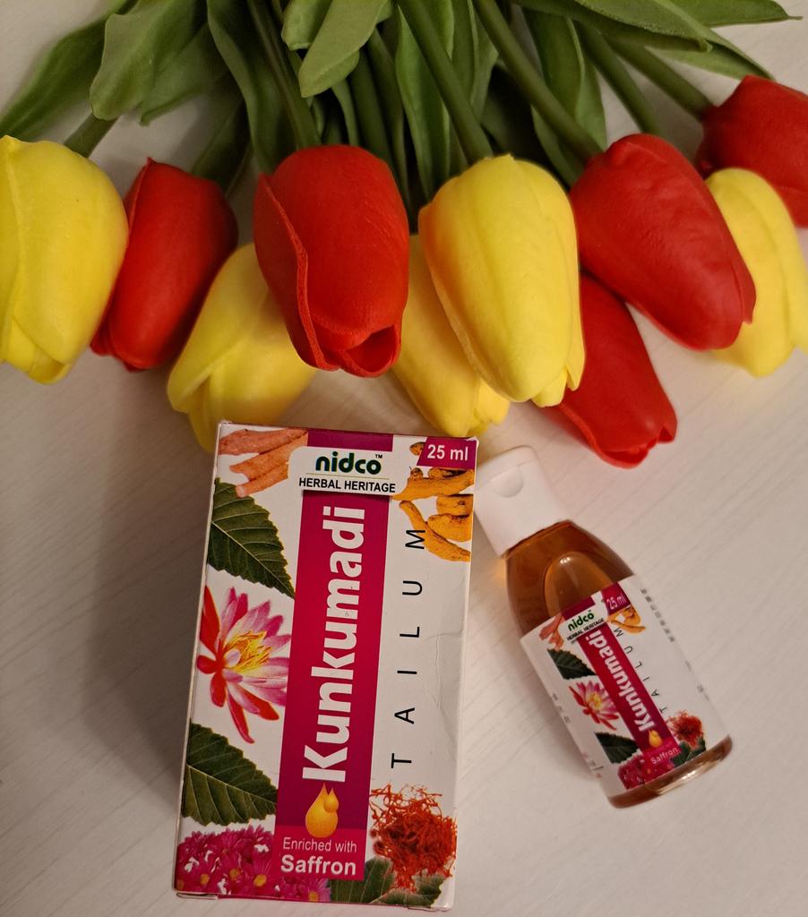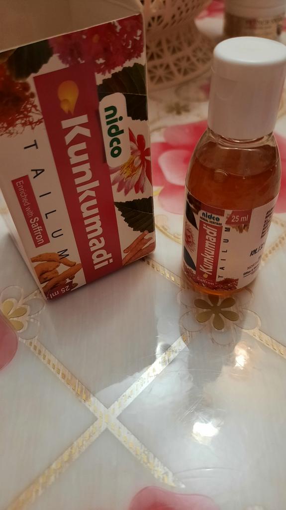 Аюрведическое индийское масло пришло в сборной посылке с ночным кремом из Индии, как всегда подарки вытащили,сволочи,при формировании заказа,потому что масло без упаковки и крем упакованы вместе,так не должно быть,ну пусть будет на их совести. Кто-то заподозрил,что масло подделка,я нашла в интернете,смотрите фото,упаковка такая же,название двойное,поэтому думаю всё нормально. После использования дополню отзыв. Аюрведическое масло для лица Kunkumadi Tailum (Кумкумади Тайлам) Nidco - путь к безупречной, сияющей и яркой коже, 25 мл. Описание Kunkumadi Tailum от Nidco это древний ритуал красоты, представляющий собой прекрасную смесь шафранового масла и экзотических трав, смешанных с использованием аюрведических правил в уходе за кожей. Это мощное масло для лица делает кожу сияющей и ровной, уменьшает появление темных пятен и тусклой кожи. С возрастом клетки нашей кожи становятся тусклыми и медленными. Масло кумкумади помогает укрепить наши клетки кожи, снабжая их питательными веществами, необходимыми для улучшения состояния кожи. Помогает добиться безупречной, сияющей и яркой кожи. Масло кумкумади сводит к минимуму мелкие морщинки, делает кожу гладкой и молодой. Глубоко питает кожу и действует как тоник для лица, очищающее и увлажняющее средство. Подходит для всех типов кожи и придает освежающее сияние лицу. Этот чудесный травяной отвар, который служит волшебным средством для защиты кожи и лечения различных кожных проблем. Каким бы ни был ваш тон кожи, КумКумади Тайлам осветлит ее на два тона. Для достижения наилучших результатов применяйте Кумкумади тайлам каждую неделю непрерывно в течение 2-3 месяцев. Способ применения: Увлажните кожу чистой розовой водой или любым тоником. Нанесите 2-3 капли Кумкумади Тайлам на ладонь. Мягко распределите его по лицу, нежно массируя движениями вверх по коже. Дайте маслу впитаться примерно 15-20 минут перед сном. Оставьте на ночь и смойте утром натуральным средством. Для достижения наилучших результатов используйте его ежедневно перед сном. Действие: Добавляет сияние коже Удаляет прыщи, пятна, шрамы и морщины Делает кожу сияющей и красивой Действует как тоник для лица, очищающее и увлажняющее средство Обеспечивает сияние Стимулирует кровообращение и восстанавливает клетки кожи Уменьшает признаки старения, такие как тонкие линии и морщины Улучшает тон кожи Удаляет темные пятна и улучшает текстуру. Дополняю: вчера тестировала масло на ночь, сначала нанесла масло,сверху ночной крем из Индии фирмы SriSri, который мне очень понравился,пришёл вчера повторно вместе с маслом,минут 10 подождал,всё впиталось,пошла спать,утром кожа не сухая,ещё увлажнённая, не стянутая (мне почти 60л),высыпаний никаких нет, всё хорошо, мне понравилось,могу рекомендовать, буду тестировать дальше. Спасибо изготовителю и продавцу за качественный товар.