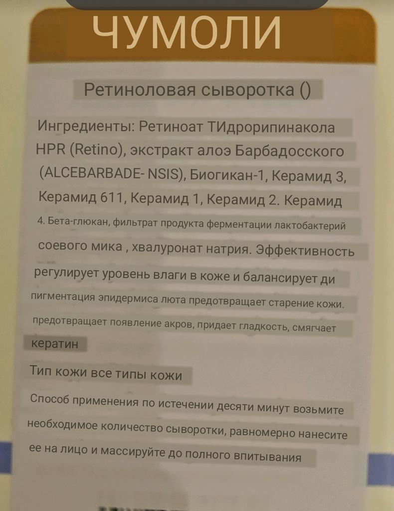 Сыворотка для лица, возрастная 30 мл.👇👇👇👇👇👇👇 Содержит Ретинол 2,5% , гиалуроновую кислоту и много полезных ингредиентов. 👇👇 (Перевод с упаковки в фото под обзором).👇👇👇👇👇 Керамиды – это важнейшие липидные молекулы, которые выполняют функцию естественного «цемента» кожи.👇👇👇👇👇 Именно благодаря керамидам, клетки эпидермиса плотно скрепляются между собой, образуя целостный эпидермальный барьер. Этот барьер надежно защищает ткани от агрессивных внешних воздействий, а также предотвращает быстрое испарение жидкости из более глубоких слоев кожи.. 👇👇👇👇👇 Ретиноад ТИдрорипинакола помогает уменьшить и компенсировать видимые признаки старения, такие как мелкие морщинки..... Сыворотка подходит для всех типов кожи. Пользоваться нужно утро/вечер на очищенную лица кожи, после чего нанести крем. Сама пользуюсь сыворотками постоянно, чтобы не было лишних морщин, крем и сыворотка дополняют друг друга и сыворотка нужна и необходима также как и крем. Пользуемся же кремами ? Почему про сыворотку забываем ?!Киселеобразной консистенции слегка мутная и ничем не пахнет. Впитывается быстро, функции свои выполняет ! Нормальная сыворотка по хорошей цене. Рекомендую! Удачи !