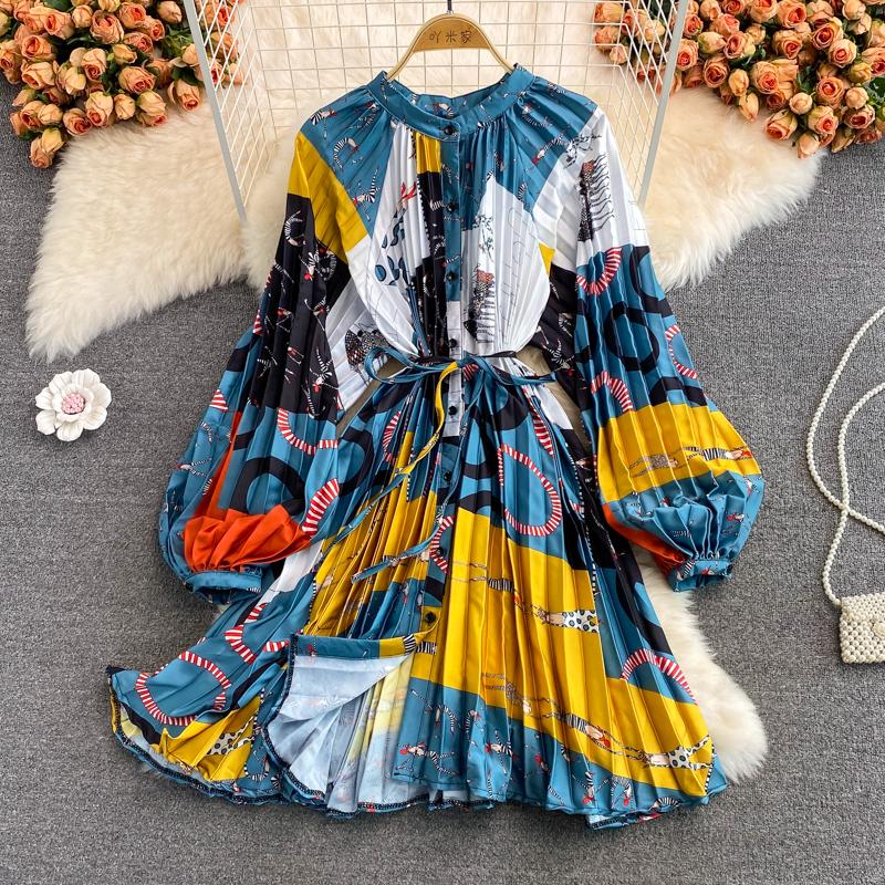RUGOD Весна и осень популярно в Европе и Америке. Свободное атласное платье средней длины с принтом и круглым вырезом.