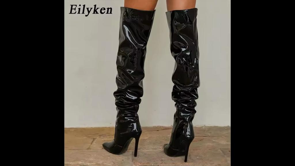Eilyken Высокое качество, плиссированные мотоциклетные ботфорты из лакированной кожи, женские модные высокие женские туфли до бедра с острым носком на молнии