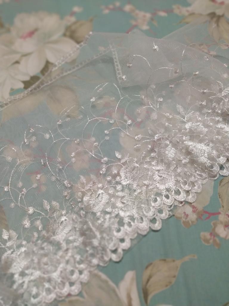 Пришло мое выиграное за 1 лей кружево. Доставка: быстро, примерно месяц. Качество: очень плотная сеточка, по ощущениям что-то вроде капрона с хорошим плетением. Цвет не чисто белый, а с молочным оттенком. Сама вышивка аккуратная, ниточки не торчат. Верхняя кромка тоже вышита. Размеры: ширина-27см, длина - 1метр Продавцу спасибо!