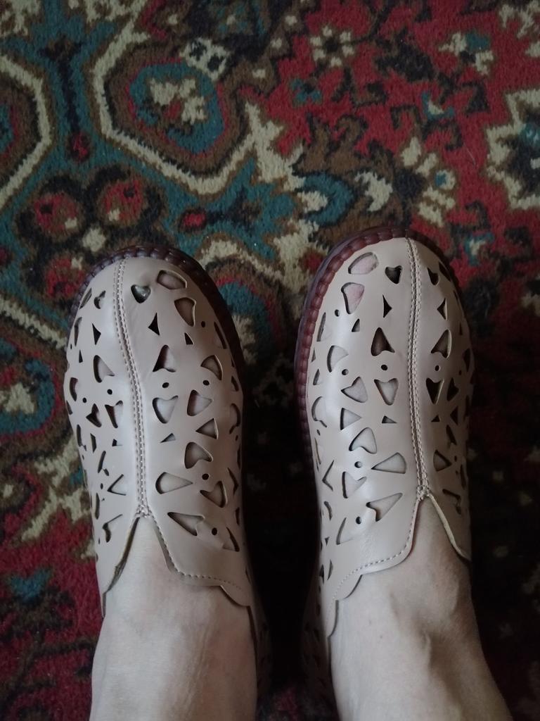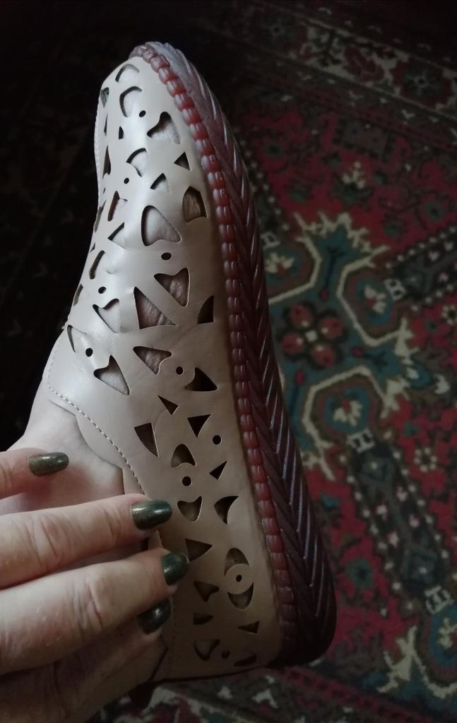 Смотрите видео. Ох уж эти сборные посылки, пока их собирают , время идёт. Вот пришли мои летние лапотули... Удобные!!! Лёгкие!!! Мягкая подошва ,стелька не вынимается!!! Длина стельки 24,5 см Обувь из полиуретана,цвет молочный. Всегда рассматриваю обувь и выискиваю широкие модели, или с перфорацией,чтобы косточка на ногах нашла свое место. В данном случае обувь широкая и на свои 24,5 см ( 39 размер) я взяла размер в размер, а обувь оказалась свободной. Уверена что летом к вечеру, когда нога отечет, мне в них будет хорошо, а если нет, вставлю стельку. Товар рекомендую тем, у кого широкая стопа, но не высокий подъем. Моя нога вошла в туфель хорошо и свободно, но некоторые пишут, что им узко.