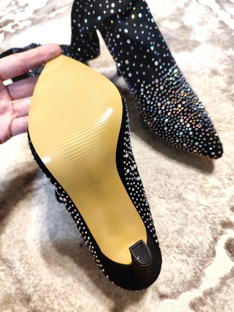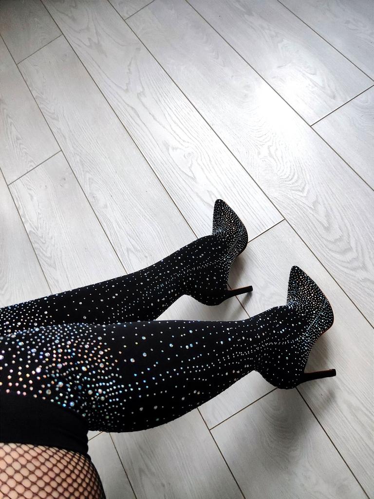 КРАСИВЫЕ САПОГИ-ЧУЛКИ со стразами от Eilyken Shoes🖤 Цвет только чёрный, размеры от 35 по 43 🎗️На неширокую стопу 24,5 см заказала 40 размер, подошли как раз, не нужно ни больше, ни меньше. А вот по объёму в самой верхней части сапоги маловаты, впиваются в ногу. Идеально подойдут на худые ноги с узкой стопой💯 ⭐По качеству всё отлично, выполнены аккуратно, камни приклеены крепко, пока все на месте) Одеваются как чулки, вся верхняя часть как плотный капрон и хорошо тянется. Колодка для меня удобная и устойчивая, но каблук высокий, около 12 см, это конечно ощутимо) Смотрятся очень красиво и утончённо, все переливаются и сверкают💥 Конечно не на каждый день, но для особого случая🔥 Присмотритесь👍😉