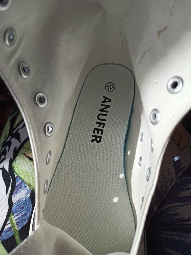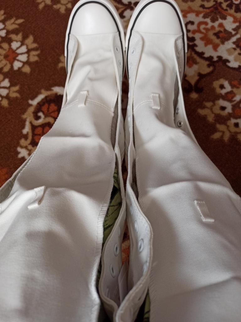 Кеды-сапожки,выполнены из текстильного хлопкового материала. Стельку вытащить не получилось .Приклеена .На длинну стопы 25.1см,заказала 41 р.В самый раз. Шнурки белые , отдельно были,чтоб можно было зашнуровать по ноге. Упакованы были с любовью)))) Продавец ,даже маску положил (чистую),не то в подарок,не то, на случай ,если запах от них резкий будет ,чтоб не нюхать)))) Да ,его собственно и не было! Но ,при внимательном рассмотрении ,на ткани есть мелкие пятна,не то ржавчина ,не то брызги.