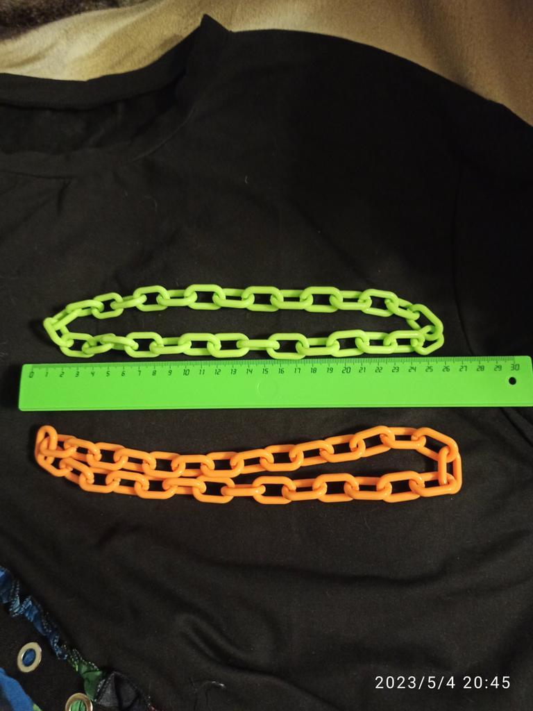 Получила 2 пластиковые цепочки. Но, к сожалению, они очень короткие. Мои цепочки на фото1, а фото 2 и фото3 - это фото покупателя Лидия Лидия. По отзывам покупателя Лидии Лидии они состоят из 34 звеньев и длиной около 60 см. А мои, оранжевая и светло-зелёная, всего по 30 звеньев и 53 см. Это кому может подойти?