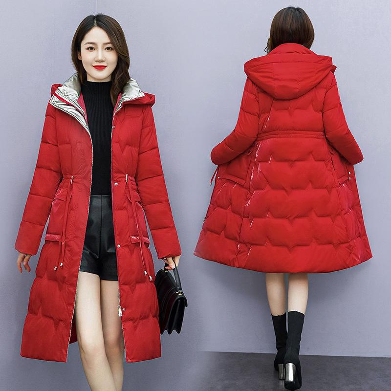 Осенне-зимнее женское однотонное яркое утолщенное теплое пальто средней длины с капюшоном на талии и шнурком — купить товар онлайн с бесплатной доставкой по всему миру!