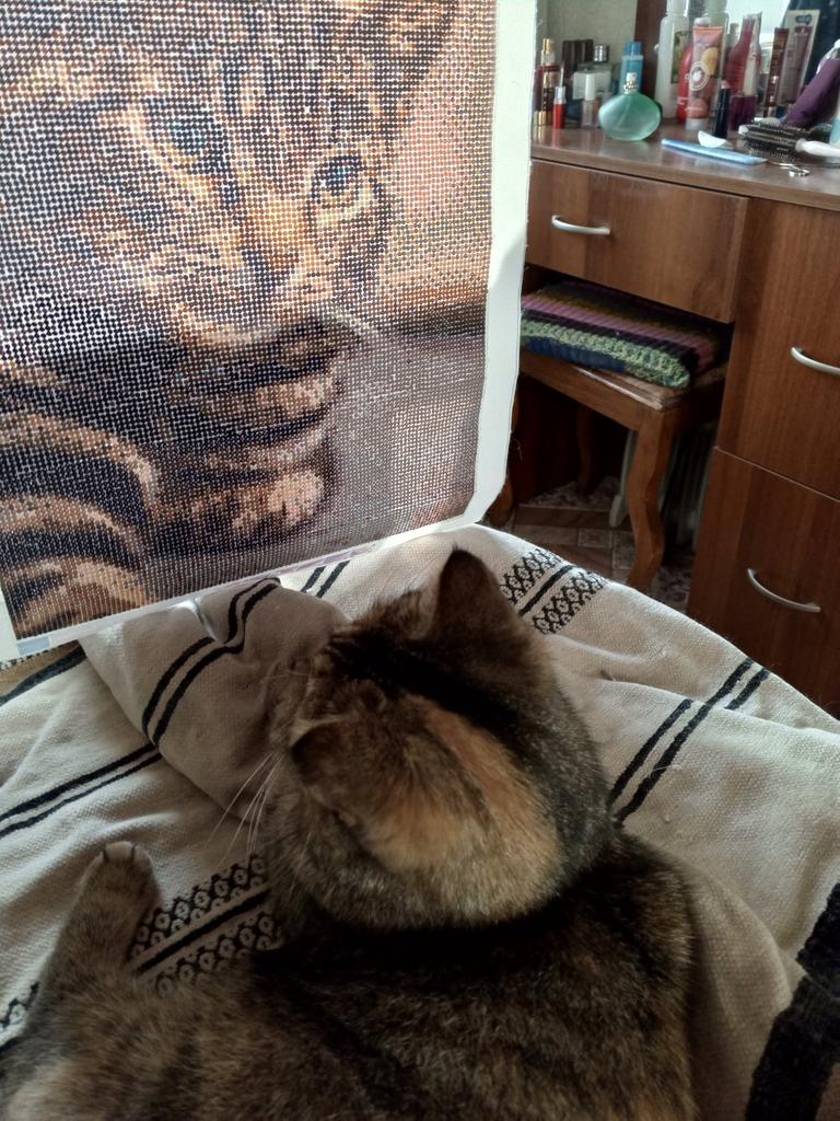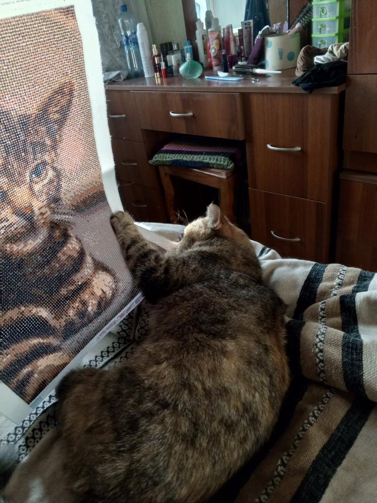 Картина просто сложена в несколько раз, а не намотана на валик из-за чего очень много заломов. Неделя под прессом ничем не помогла, завтра начну собирать, посмотрю что получится... Хотя, как показывает опыт, заломы так и останутся..Дополняю: наконец-то собрала нашу красавицу! Заломы, конечно, остались.. Главное, что всё удалось- картинка реально соответствует размеру (30*40)!! Очень редкий случай. Стразов осталось много. Самое главное- реально наша Мася! Муж счастлив! Продавца ОЧЕНЬ РЕКОМЕНДУЮ! 👍 Пыталась поймать их вместе (Масю и картину) , что получилось- на фото.