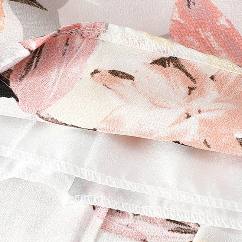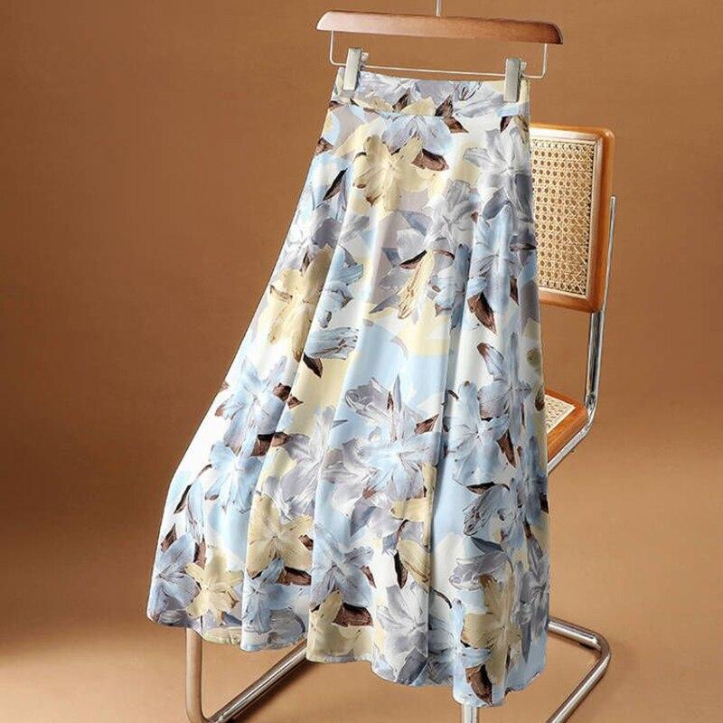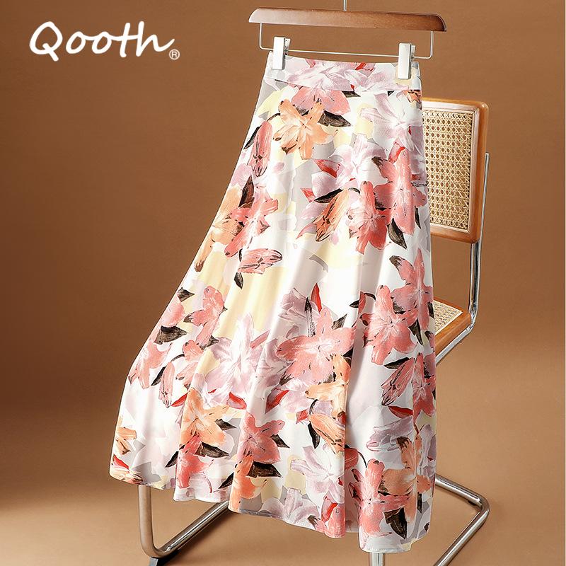 Qooth Летняя женская шифоновая юбка трапециевидной формы средней длины с цветочным принтом, элегантная длинная юбка с высокой талией QT1835