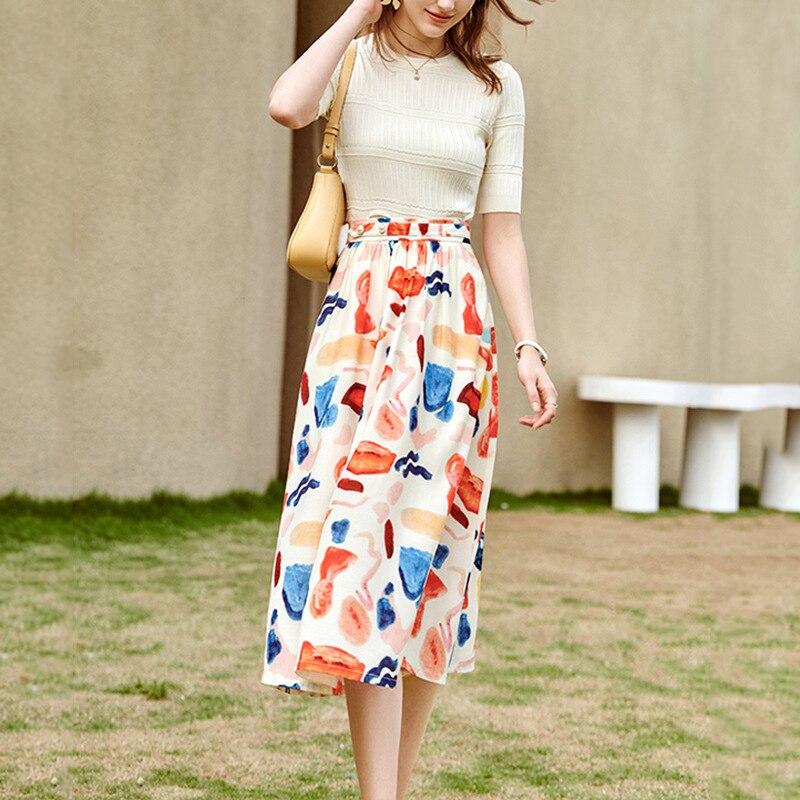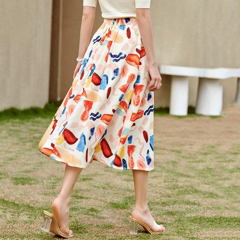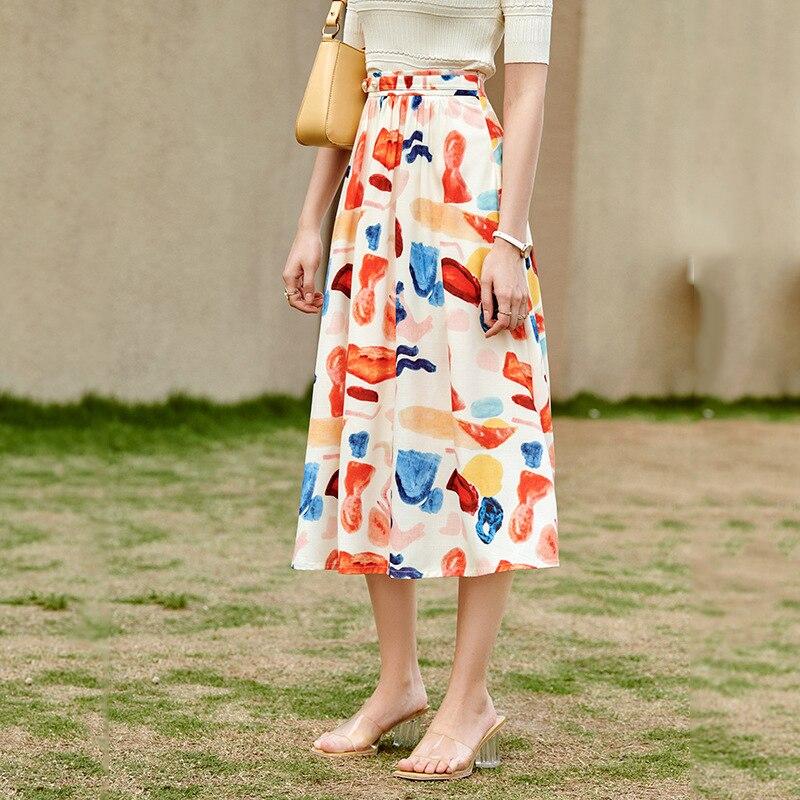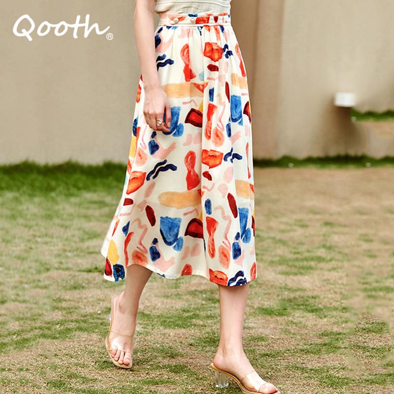 Qooth Женская летняя юбка средней длины с высокой талией и принтом, элегантная винтажная ретро-модная юбка в праздничном стиле QT1836