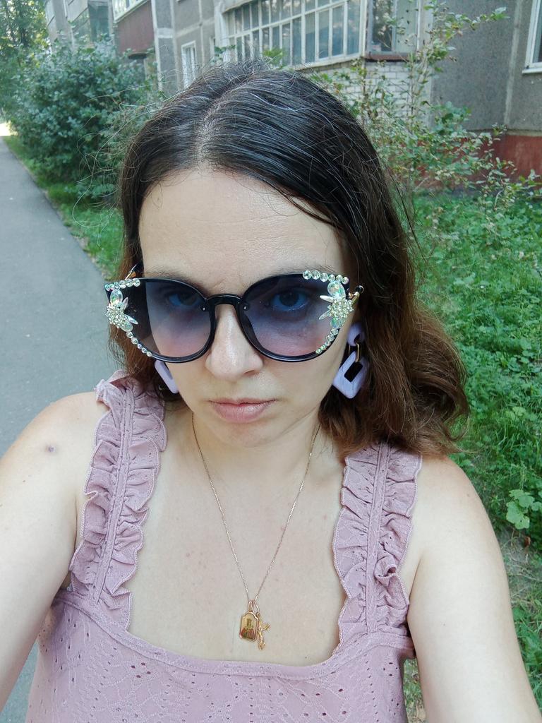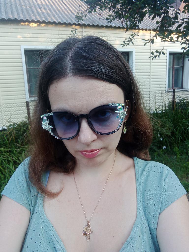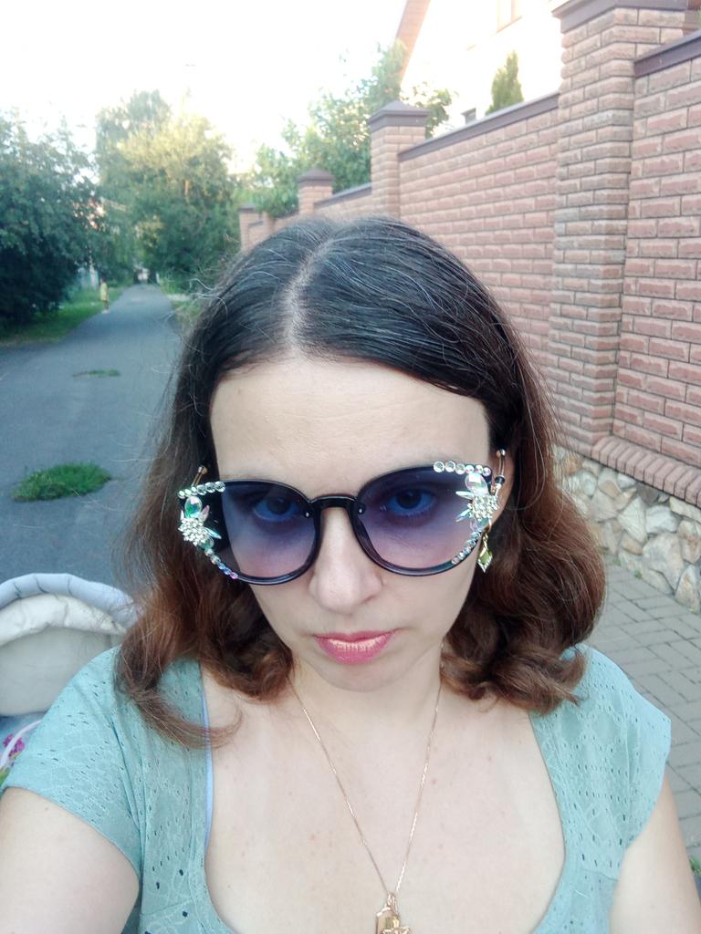 Симпатичные очки🕶, придают образу гламурный вид, заказала в синем цвете, стёкла тоже синие, прозрачные, глаза видно через очки, стразы на солнышке переливаются, смотрятся симпатично, упакованы были не слишком надёжно, но пришли целыми, без повреждений, продавцу спасибо🤗, для разнообразия покупке рекомендую🥰, но я всё же больше всего люблю с классическими черными стёклами, но обязательно закажу ещё в каком-нибудь цвете