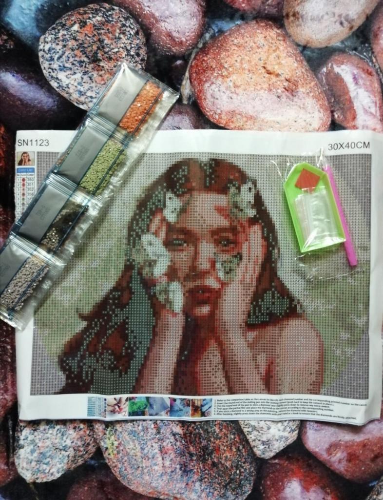 Алмазная выкладка "Девушка и бабочки" без подрамника В комплект входит: 🔸Полотно с клеевой основой, пронумерованными ячейками и инструкцией на английском языке. 🔸Стилус, 🔸 Сухой клей для стилуса, 🔸Лоток для страз, 🔸 Комплект цветных страз. Была скручена в рулон, но складок нет Классная штука! Очень довольна приобретением! Доставлена в почтовое отделение за 1,5 месяца живым треком в сборной посылке. Товар и продавца рекомендую 👍