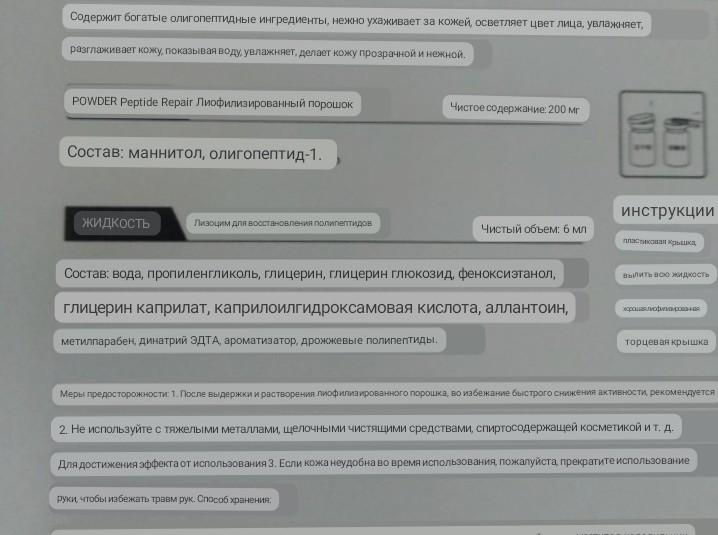 Лиофилизированный порошок с пептидами Я бы сказала, что это альтернатива сывороткам, но текстура прям совсем водянистая. Моя кожа хорошо отреагировала на это средство, стала увлажненной, ровной и более нежной. В фирменной коробочке 6 ампул: 3 с порошком и 3 с раствором и 3 пипетки для удобного нанесения. Способ применения: смешать порошок с раствором, одеть пипетку. Наносить на чистую кожу лица, шеи и декольте. Мне очень понравилось пользоваться этой средством под аппарат мезопорации с микротоками. В описании продавца сказано, что средство увлажняет и тонизирует кожу, обладает отбеливающим и лифтинг эффектом, улучшает цвет лица, сужает поры и снимает воспаления. Информация с просторов интернета: Молекулы пептидов небольшие, поэтому могут проникать сквозь роговой слой и развивать в коже бурную деятельность. Полезные свойства пептидов помогают: 🔸активизировать синтез коллагена; 🔸восстанавливать кожу и ускорять 🔸заживление повреждений; 🔸уменьшать воспаления и повышать иммунитет кожи; 🔸замедлять процессы гликации, то есть «засахаривания» волокон коллагена, приводящего к их хрупкости; 🔸улучшать микроциркуляцию в сосудах и капиллярах; 🔸успокаивать чувствительную кожу; 🔸корректировать пигментацию; 🔸работать как антиоксиданты. Насколько пептиды эффективны, настолько они и капризны. И если вы не замечаете эффекта от применения крема с пептидами (а одно из достоинств этих соединений — высокая скорость работы), проверьте, с какими средствами вы его сочетаете. Дело в том, что пептиды не терпят соседства ретиноидов и кислот — теряют свои способности. Избегать попадания прямых солнечных лучей. Готовый препарат хранить в холодильнике. В случае дискомфорта, прекратить применение. Сыворотка доставлена в почтовое отделение за месяц живым треком в сборной посылке 👍 Товар и продавца рекомендую 👍🥰