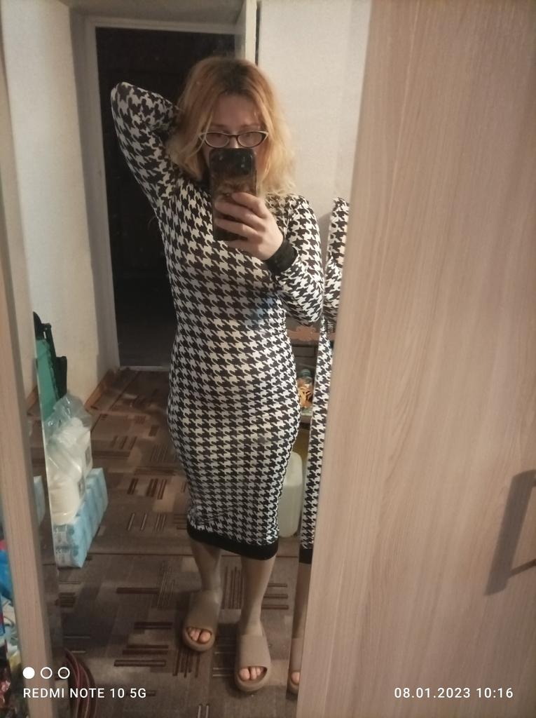 Классное платье хорошее лекало, Классное, в обтяг, на мне s- ка мне нормально но резинка на рукавах и в подоле окантовка темная внатяг тянутся с трудом, внизу платье заканчивается ею и рукава, поэтому в платье ходить мелкими шажками, по ширине тянется ткань платья но окантовка темная резинка тянется с трудом, поэтому если у вас широкие запястья рук или размеры больше моих( 90*72*90 рост 162 вес 60) берите больше размер, а так очень эффектно вживую смотрится