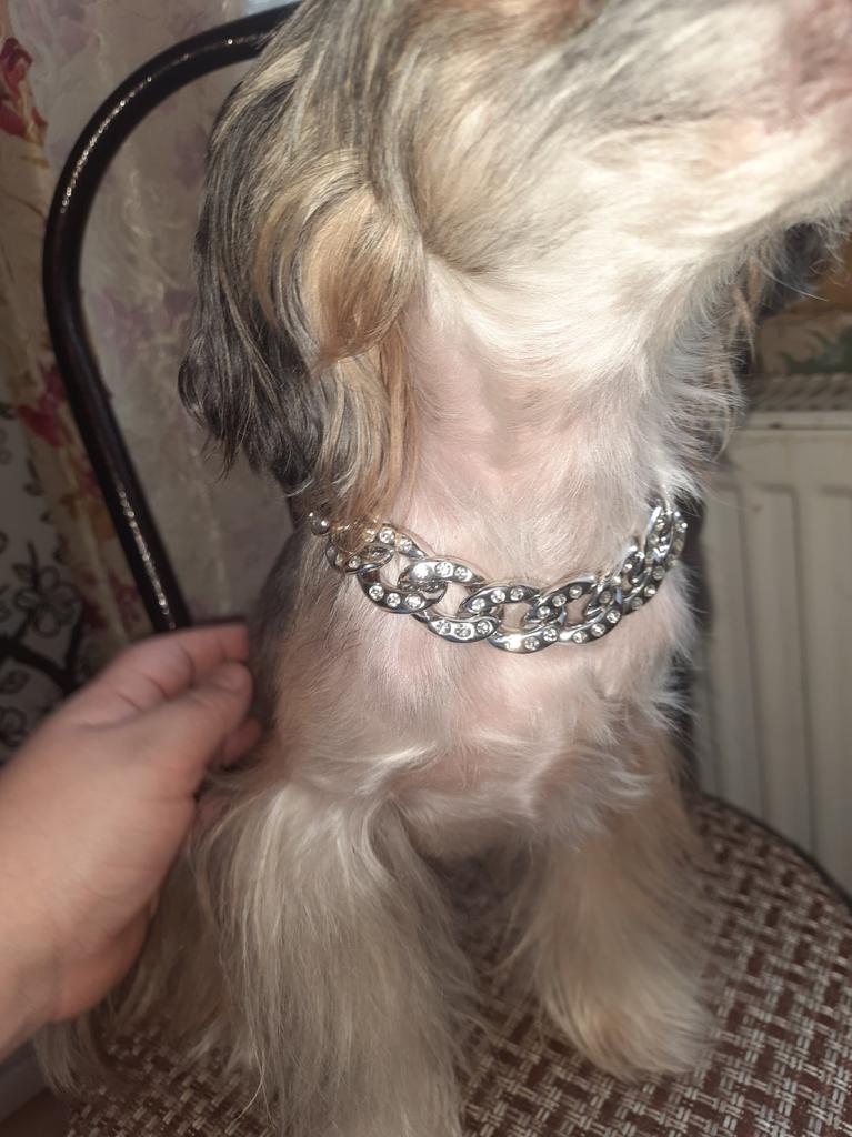 Ошейник цепочка прикольная . Нам очень понравилось. Сделанные из пластика покрыто серебром, камушки все на месте. Практически невесомый.