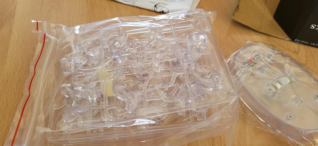 С виду всё целое. Коробка помята не сильно. Детальки запечатаны в пакетик, карточки в другой. Прям ваще...