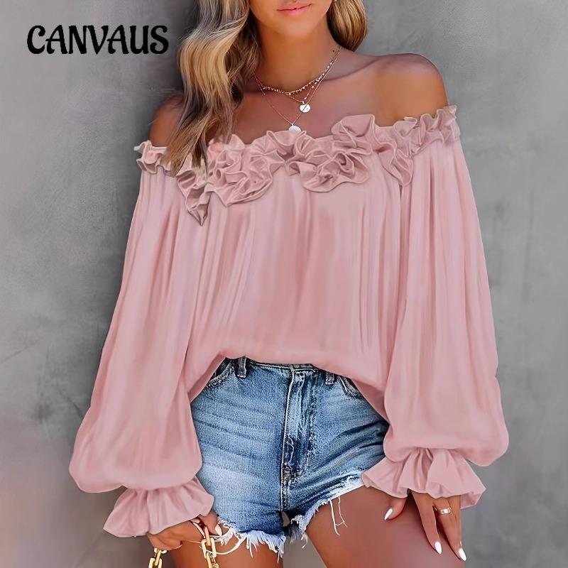 Осенняя сексуальная шифоновая рубашка с одним словом и воротником без бретелек, новая свободная верхняя женская одежда с рукавами-фонариками — купить товар онлайн с бесплатной доставкой по всему миру!