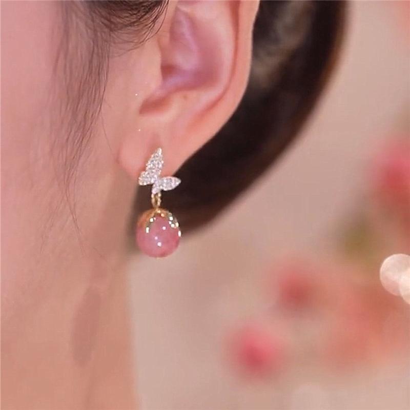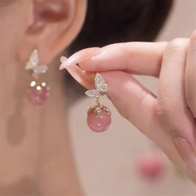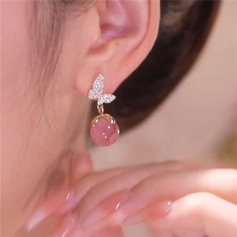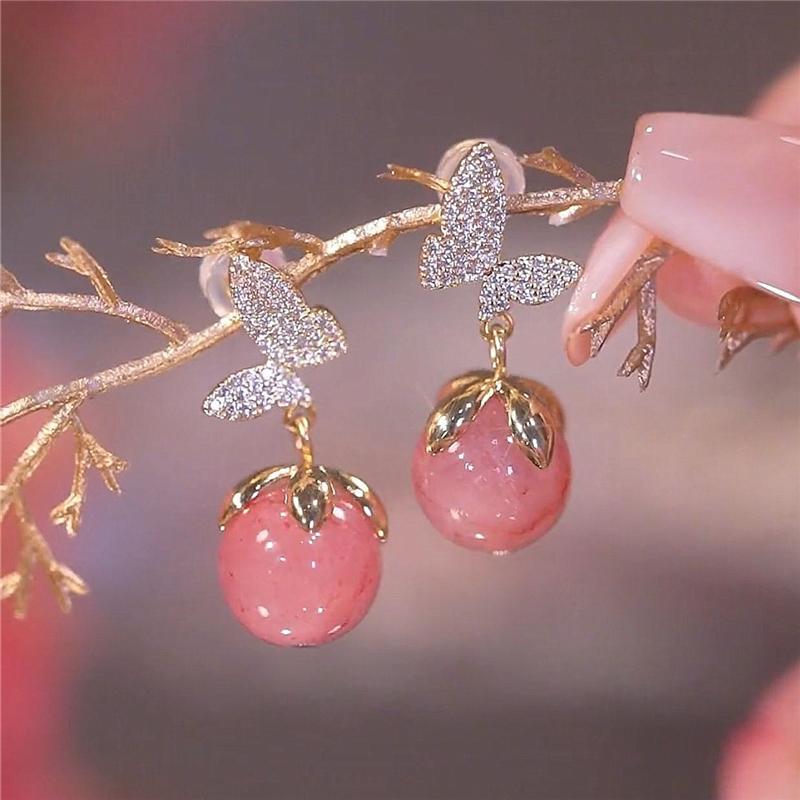 Сладкие розовые серьги-капли с круглыми камнями для женщин, роскошные серьги-бабочки золотого цвета, женские модные ювелирные изделия