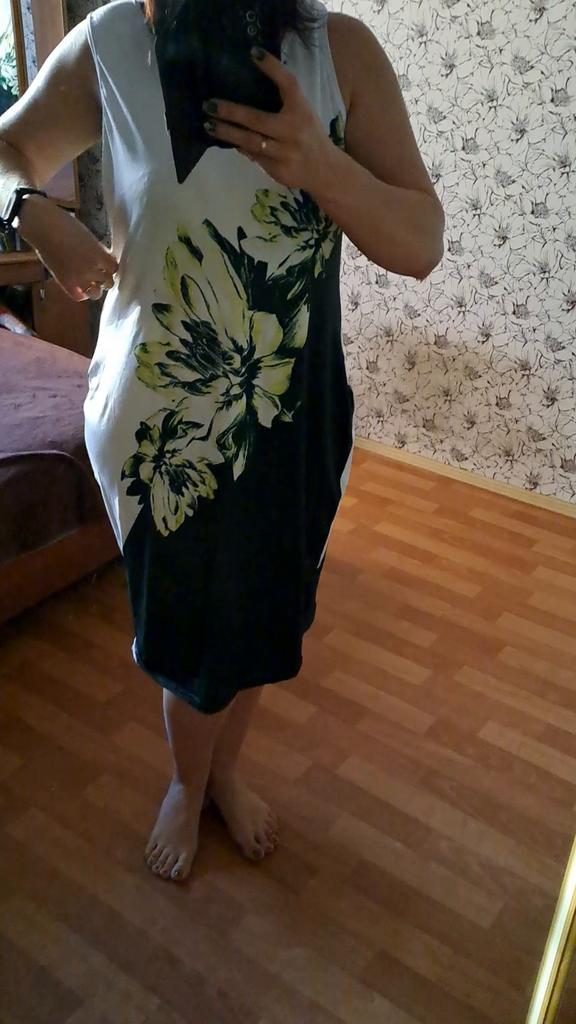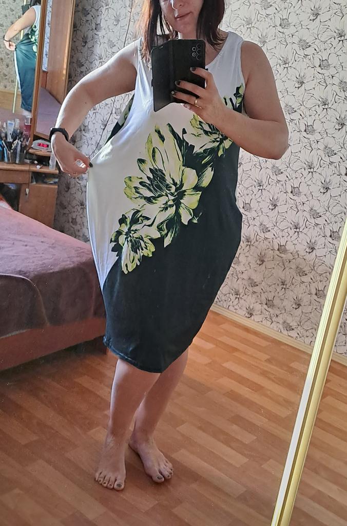 На мой 48-50 подошло, почти. Длинновато(ну рост у меня 152), это не удивительно, в бёдрах прям галифе, скроено прям по фигуре "песочные часы", но к сожалению нет такой талии и таких бёдер в жизни. Пришлось отрезать по бокам и низ. А так синтетические лёгкое платье, с ярким рисунком. Чуть просвечивает, на тёмное белье я бы не рискнула надевать.