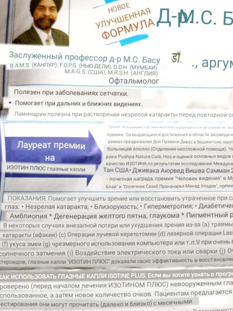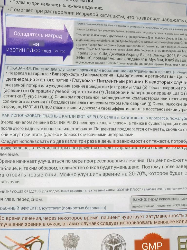 Капли для глаз Айсотин Плюс от Джагат Фарма(Индия🇮🇳). Капли Айсотин давно известны и отлично зарекомендовали себя во всем мире. 📌Пришли в упаковке на 5+ В коробке, внутри много пупырки. Сама коробочка в воздушной подушке. Идеальное состояние. 📌Флакончик 10мл. И на коробке ,и на бутылочке есть информация и срок годности.С момента изготовления хранение 2 года. Внутри был вкладыш с подробной информацией на англ. и хинди. 📌Капли применяются для лечения практически всех заболеваний глаз: близорукости, дальнозоркости, диабетической ретинопатии, они помогут при цветовой слепоте, дегенерации желтого пятна, пигментном ретините, даже при глаукоме.Но от заболевания зависит и курс лечения. 📌 Капли можно использовать и здоровым людям для профилактики глазных заболеваний и снятия усталости глаз . 📌Как применять капли Айсотин плюс: - закапывать по две капли в каждый глаз два раза в сутки. Курс может составлять от 60 до 90 дней; - для профилактики, для тонуса глаз, устранения сухости, закапывать по одной капле в каждый глаз, один раз в день. 📌Противопоказания: гиперчувствительность к компонентам препарата. 📌 Условия хранения: Хранить в сухом, прохладном месте, защищённом от влаги и воздействия прямых солнечных лучей, при температуре не превышающей 30 С. Не хранить в холодильнике. 📌Состав можно прочитать в описании. 📌Капли хорошие. Я применяю для профилактики. Когда долго находишься у монитора и все буквально расплывается, они помогают снять напряжение, появляется чёткость. Рекомендую👍
