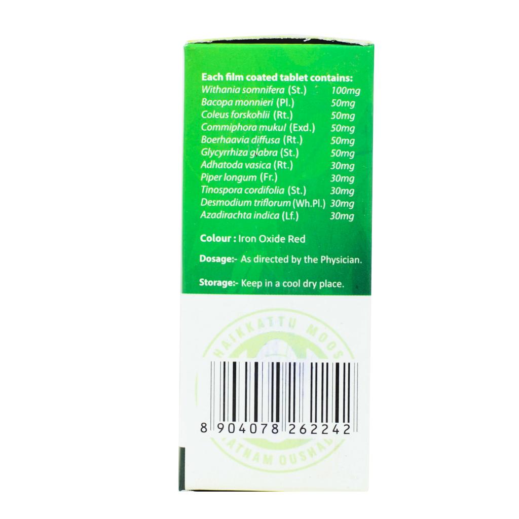 Ашваганда (Withania Somnifera) – 100 мг, Брахми (Bacopa Monnieri) – 50 мг, Форсколия (Coleus Forskohlii) – 50 мг, Коммифора мукул (Commiphora Mukul) – 50 мг, Пунарнава (Boerhaavia Diffusa) – 50 мг, Лакрица (Glycyrrhiza Glabra) – 50 мг, Юстиция сосудистая (Adhatoda Vasica) – 30 мг, Перец длинный (Piper Longum) – 30 мг, Гудучи (Tinospora Cordifolia) – 30 мг, Десмодиум трехцветковый (Desmodium Triflorum) – 30 мг, Ним (Azadirachta Indica) –30 мг.