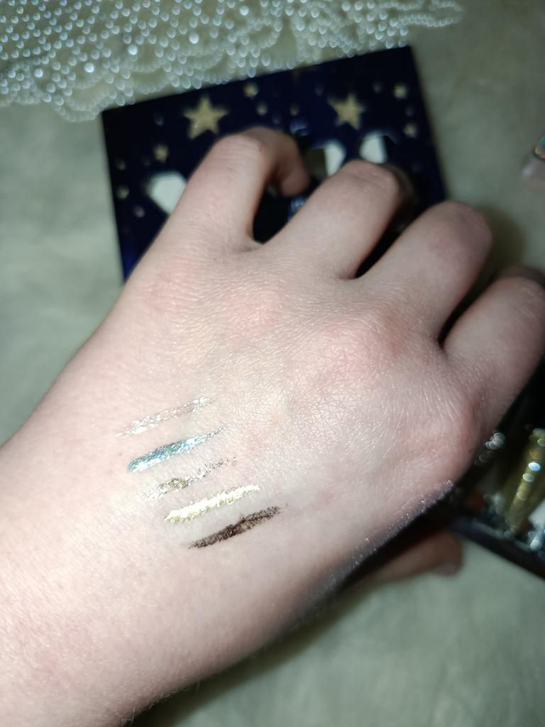 ✨Сверкающая подводка для глаз 👁️ Набор из 5 блестящих подводок для глаз. 🤍🩶💛🖤 Очень люблю яркую косметику с блёстками, поэтому не смогла пройти мимо этого набора. Не определилась с цветом, решила взять весь набор. 🩶 Флакончик с подводкой маленький, но это удобно, не успеет засохнуть. Не очень удобно держать в руках, слишком уж маленькая, но это дело привычки; ✨ Набор соответствует промо фото, упаковка яркая, флакончики из прозрачного пластика, сам набор очень красивый, подойдёт для подарков; 🤍 В наборе представлены 5 цветов: белый, сверкающий серебряный, радужный серебряный, золотой и черный. Цвета соответствуют. Ложаться хорошо, сама подводка имеет хорошую консистенцию, кисточка очень мягкая и тонкая, получаются хорошие тоненькие стрелки. Шиммер среднего размера, если слишком много нанести, может быть дискомфорт; 🖤 Отличный набор, прекрасно подойдёт для праздничного макияжа и на каждый день. Рекомендую 💯